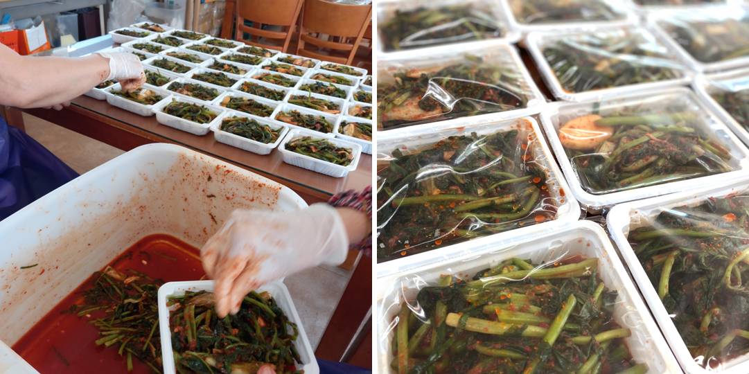 열무김치를 밑반찬과 함께 포장하여 재가어르신들과