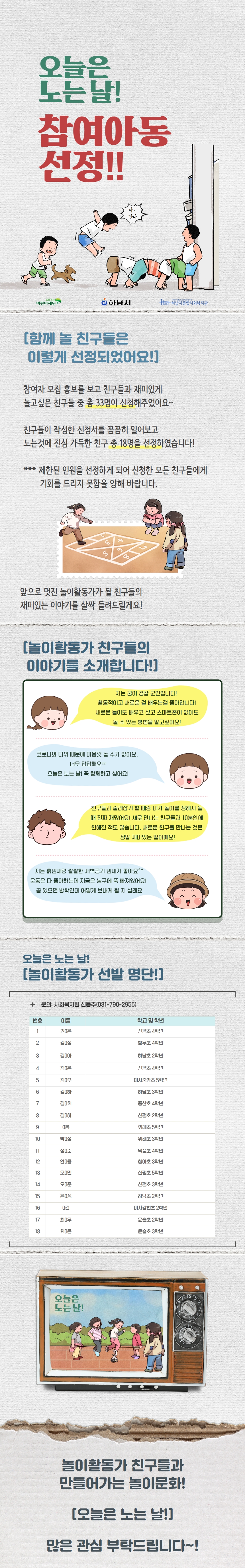 오늘은 노는 날! 참여자 선정! 작성일 : 2022.07.27 | 조회수 : 8044 ※선정된 학생의 보호자 분들을 대상으로 공지사항 전달을 위한단체 카톡방을 금일(27) 오후 5시 경 개설할 예정이오니 참고 부탁드립니다※
