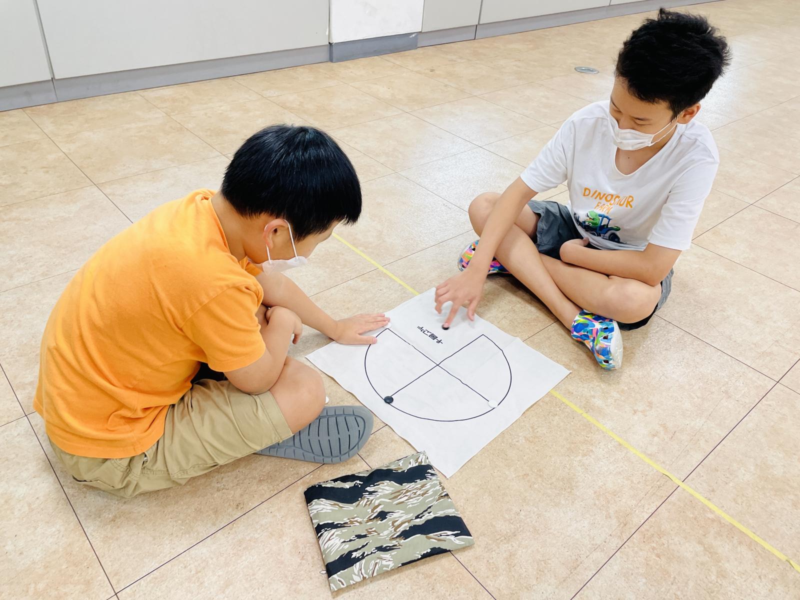 칠판을 중심으로 강당 오른쪽을 1루, 뒷쪽을 2루, 왼쪽을 3루로 지점을 정했어요.