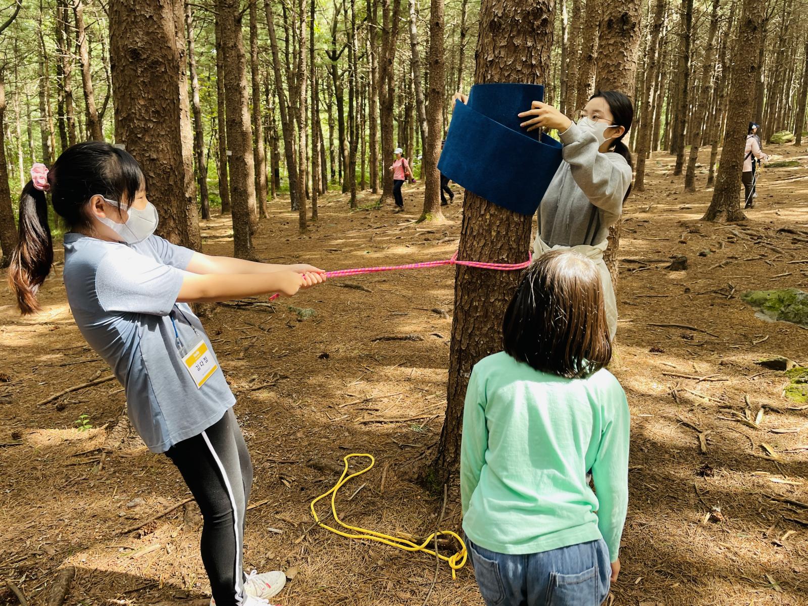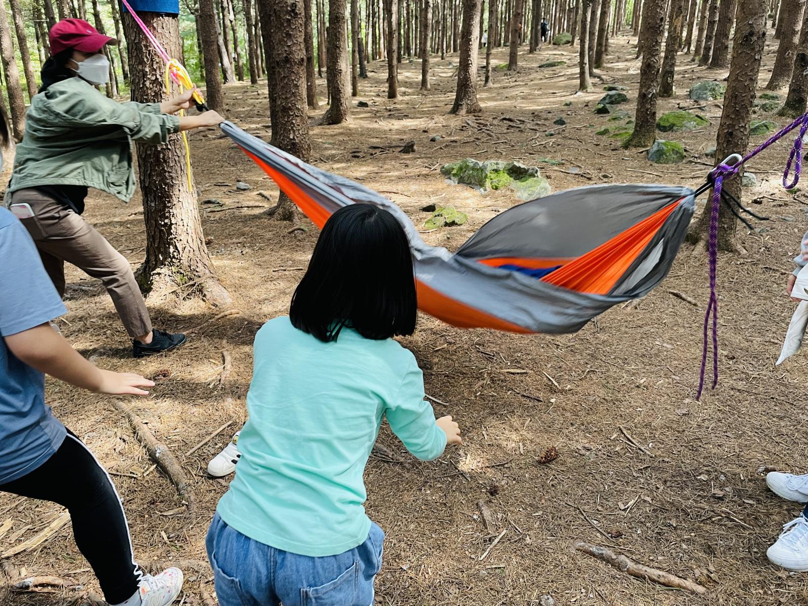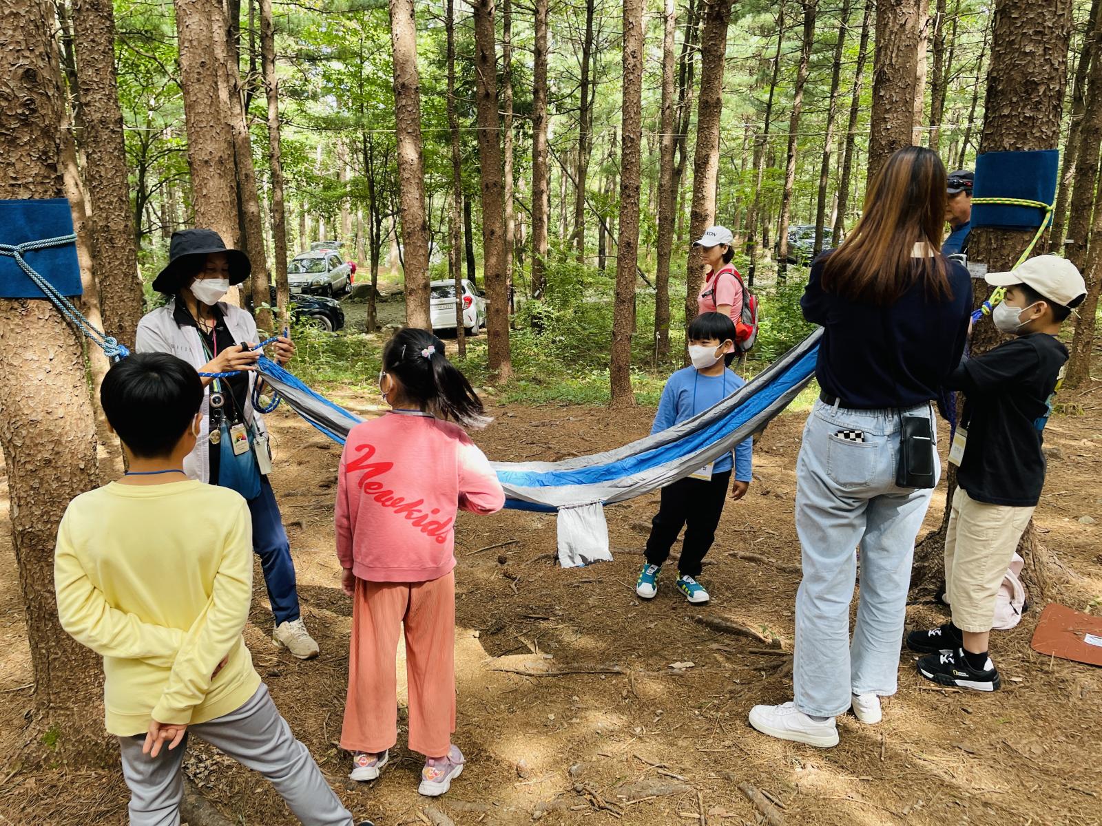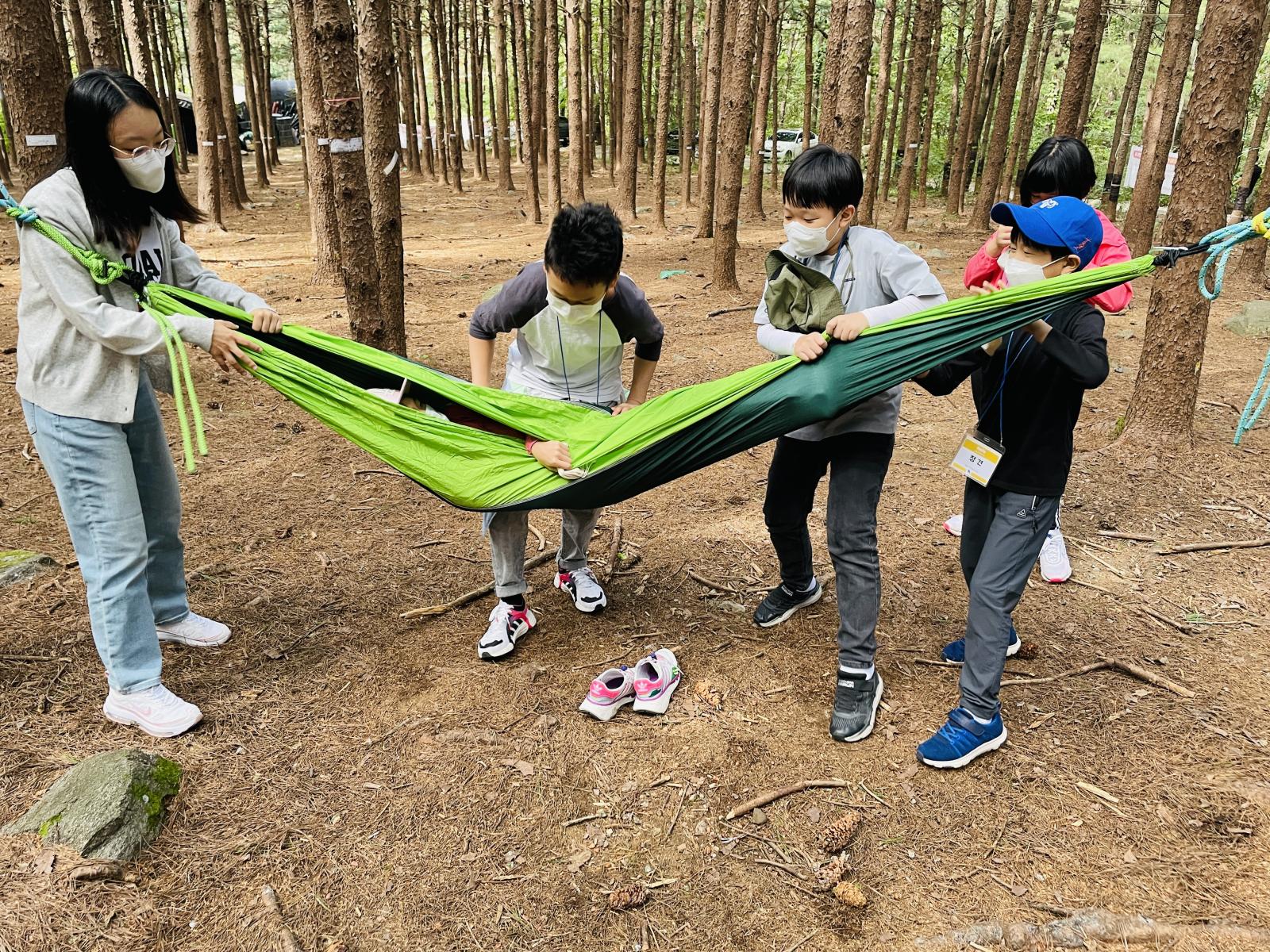 으쌰으쌰 다같이 힘을 합치고, 선생님의 도움을 받아 해먹을 설치했어요!