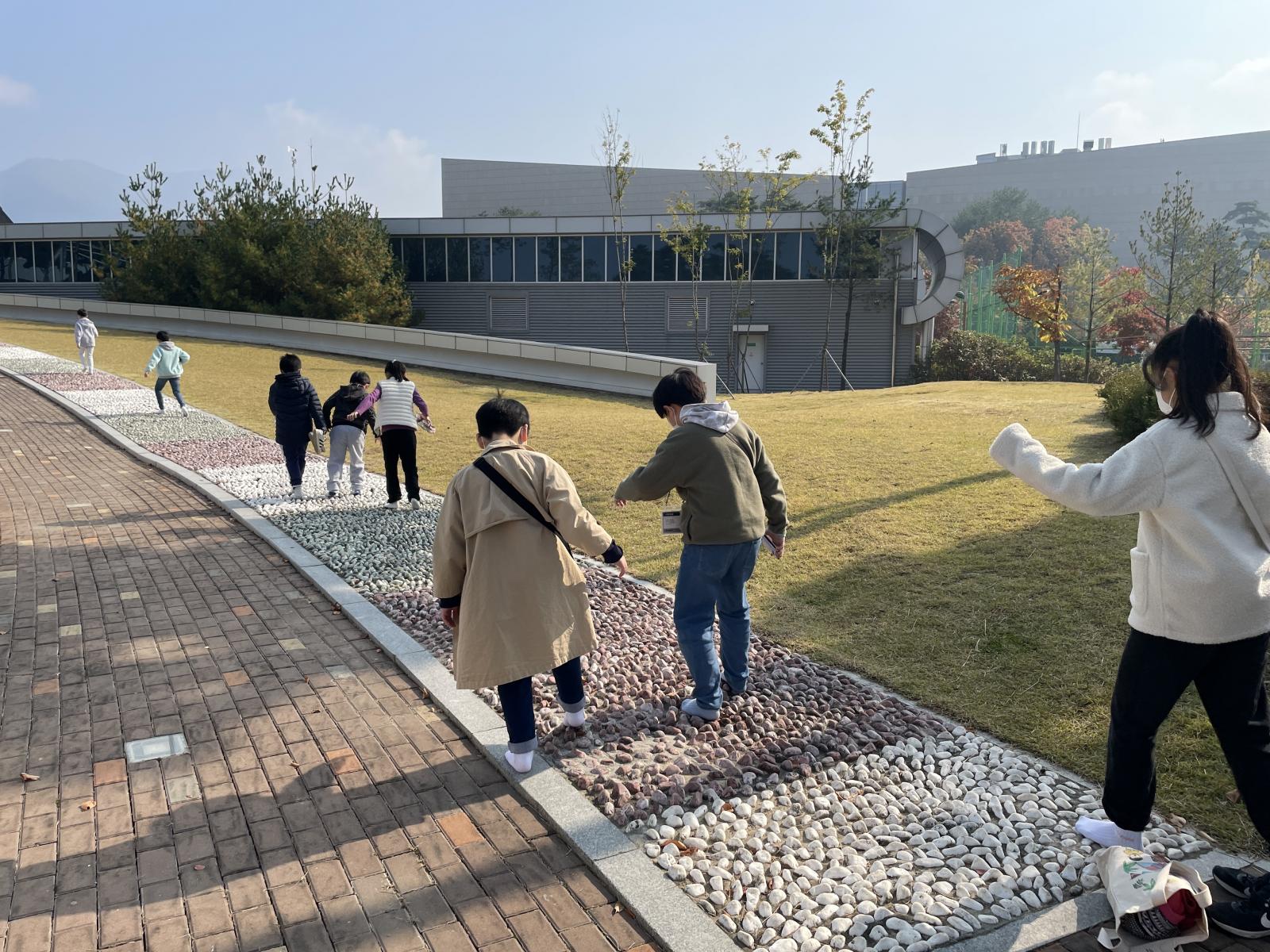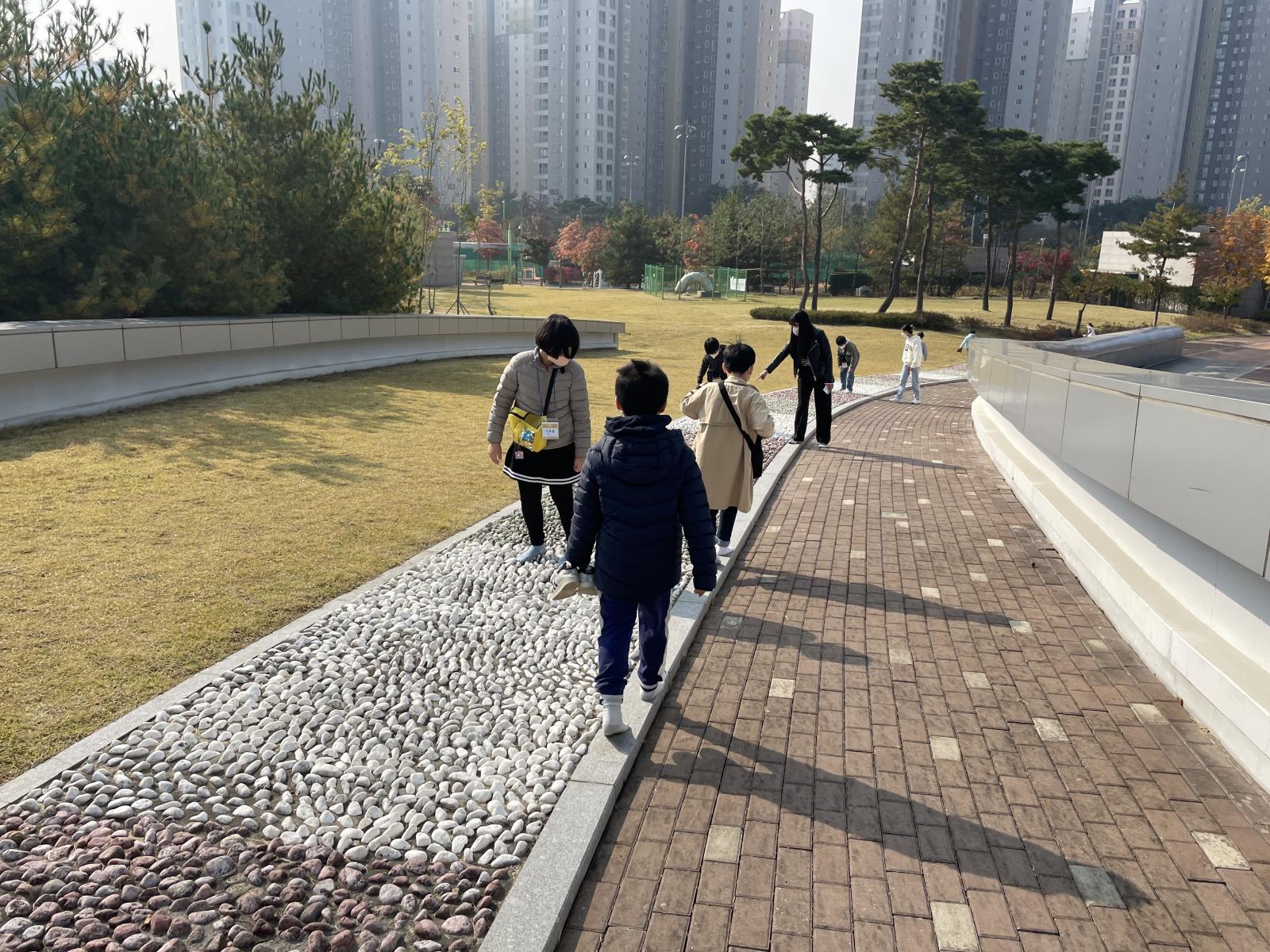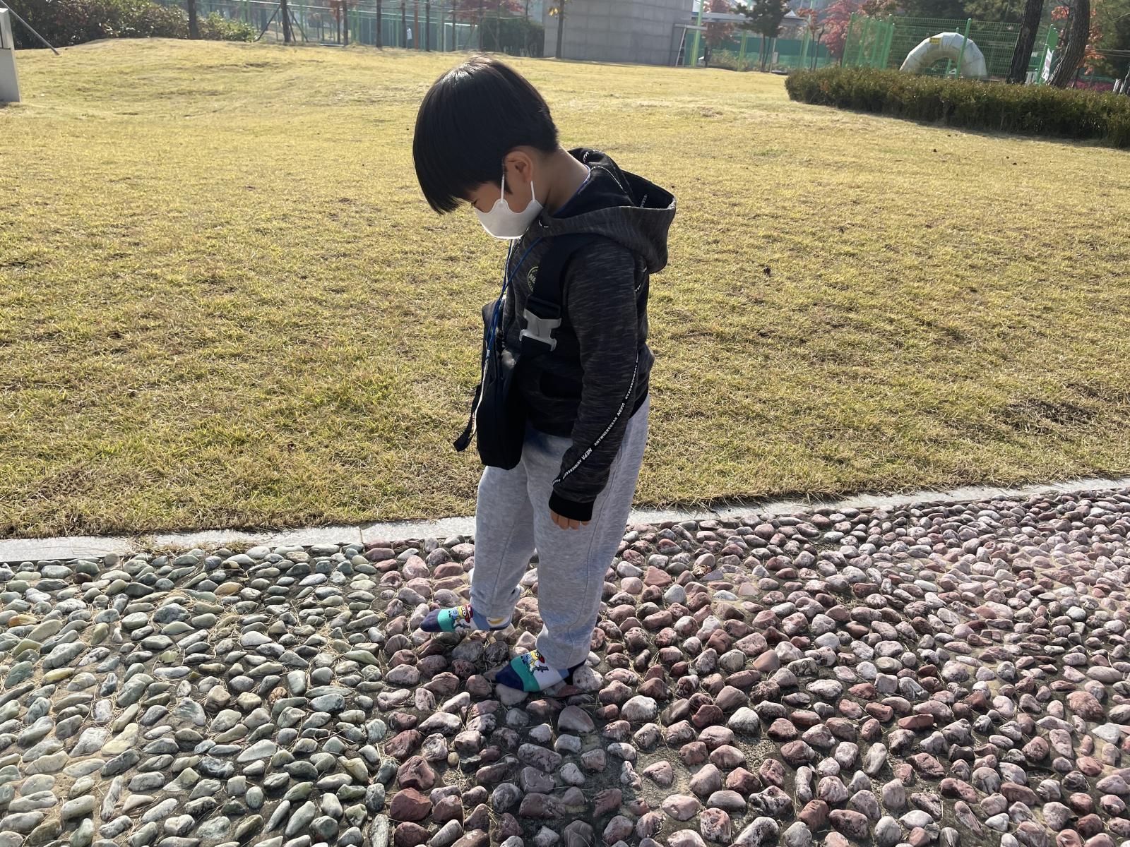 친구들이 지압코스 걷기에 몰두해있을 때