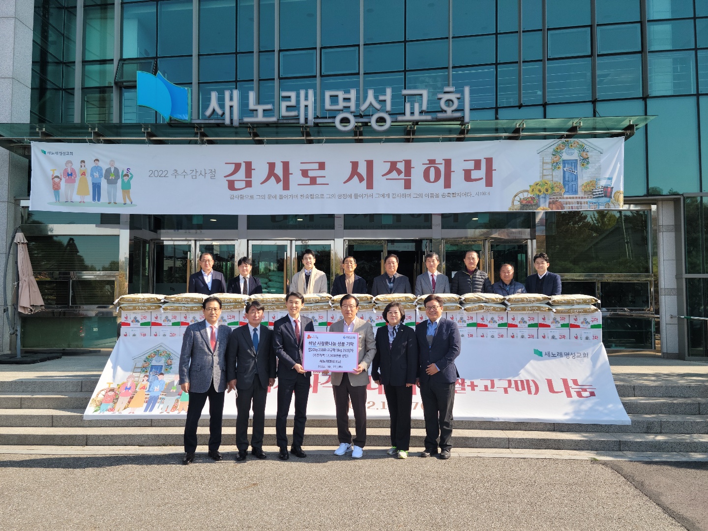 새노래 명성교회 후원물품 전달식 작성일 : 2022.11.02 | 조회수 : 6573 지난 27일 새노래명성교회 고은범 담임 목사님께서 "어려운 이웃들에게 도움이 되었으면 좋겠다."며, 백미20kg 125포를 후원해주셨습니다.전달 받은 나눔 백미는 관내 저소득가정과 경기먹거리 그냥드림사업을 이용하는 어르신들께 전달될 예정 입니다.따뜻한 나눔에 감사합니다.
