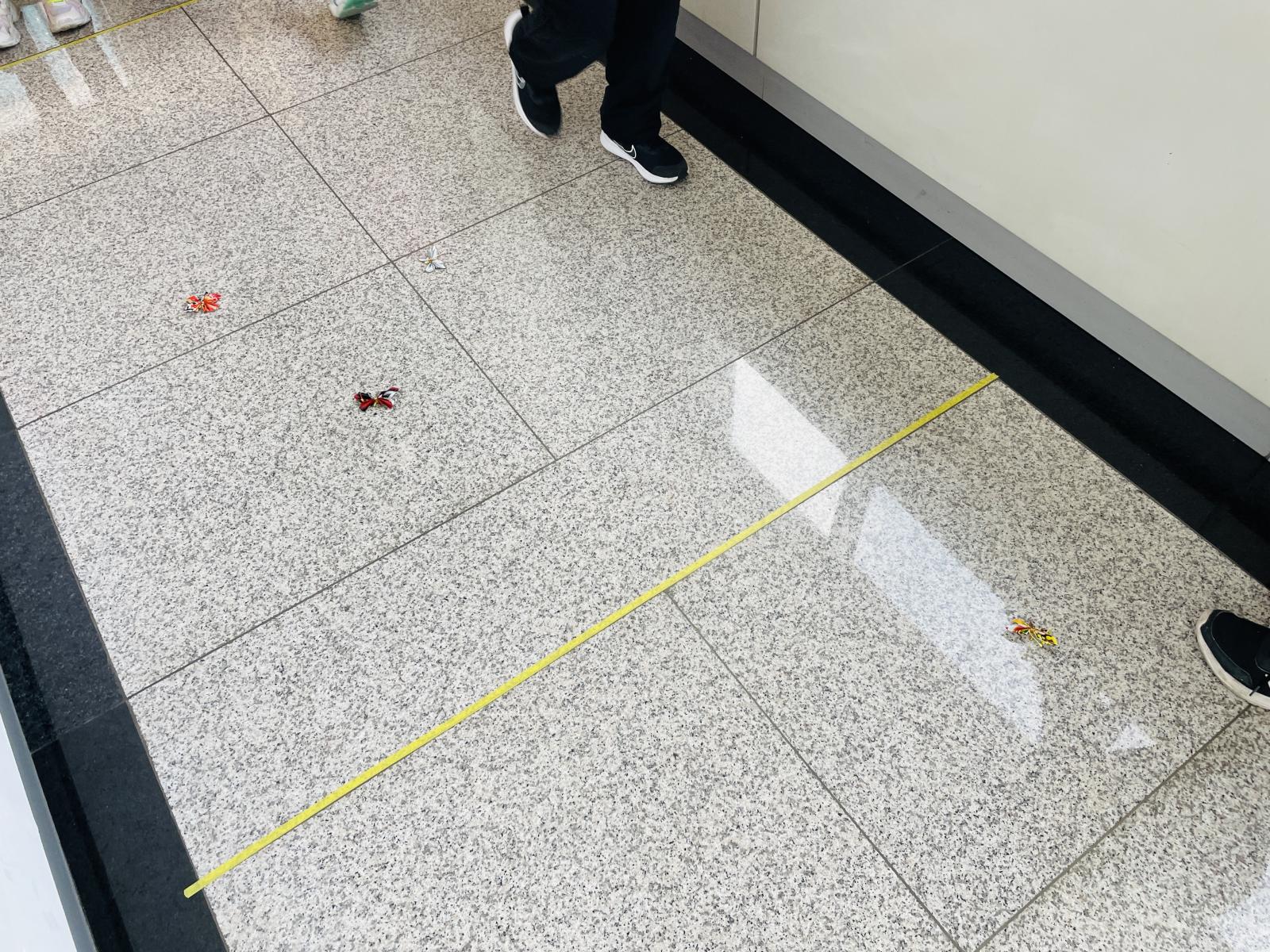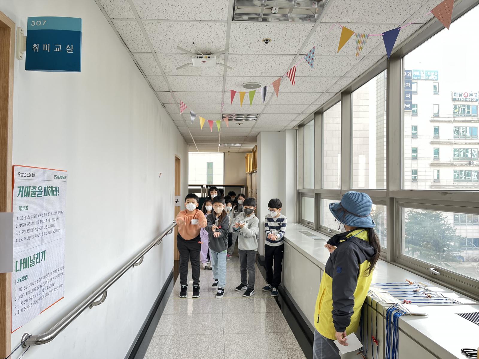 선에 맞추어 나란히 서서 손바닥에 나비를 올려놓고