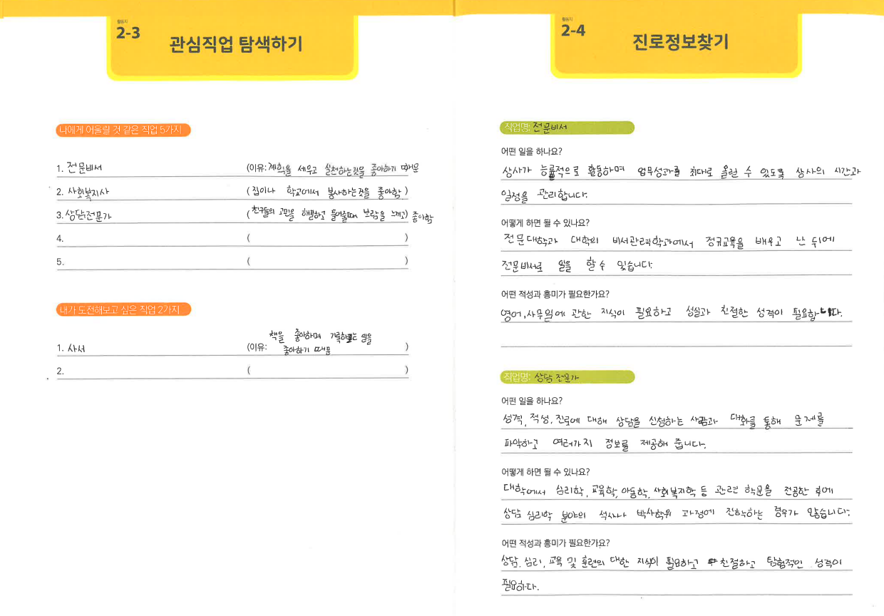 자신의 흥미와 어울리는 직업을 탐색해 보는 시간을 가졌어요.