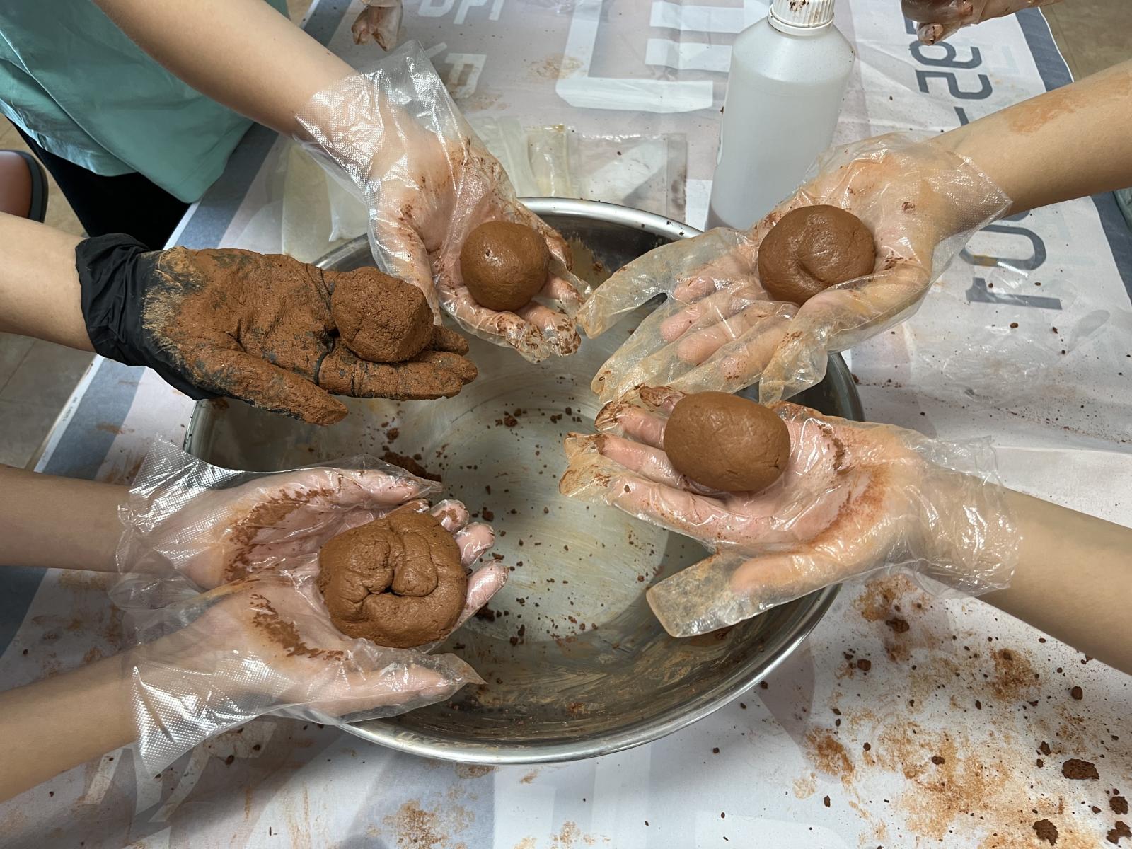 유용미생물 EM용액과 황토를 섞어 흙공을 만들어요.