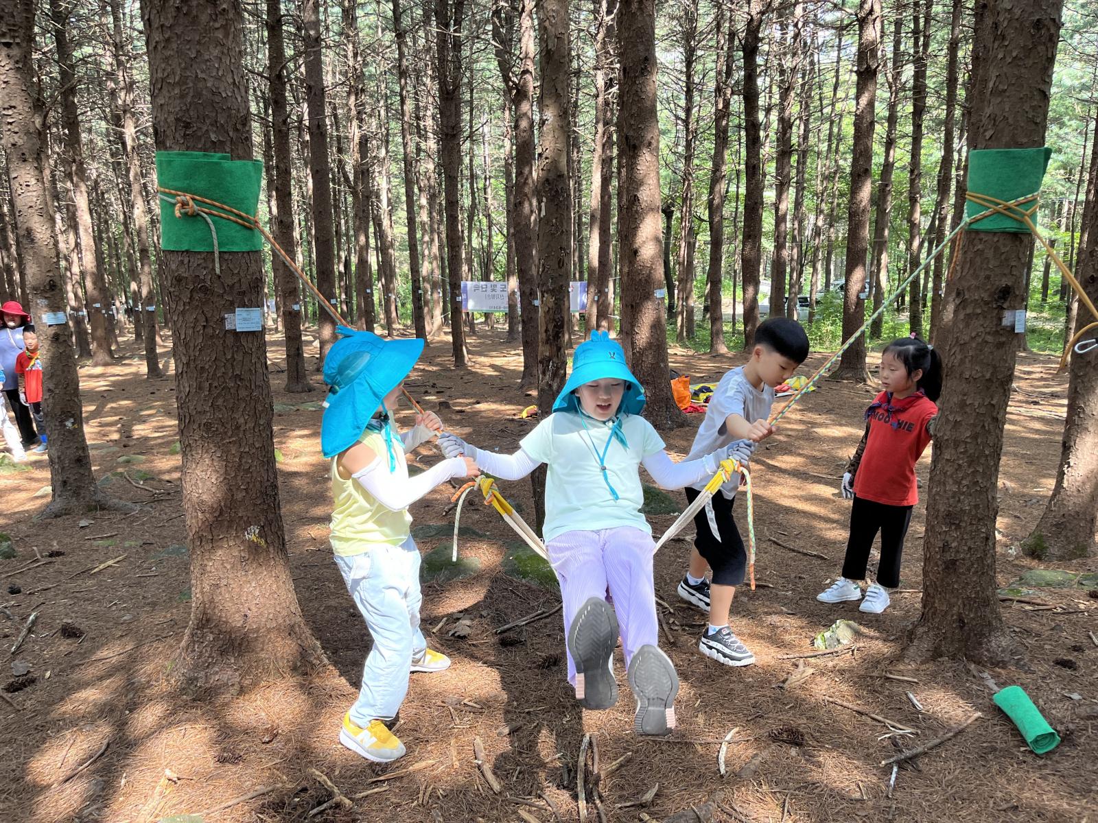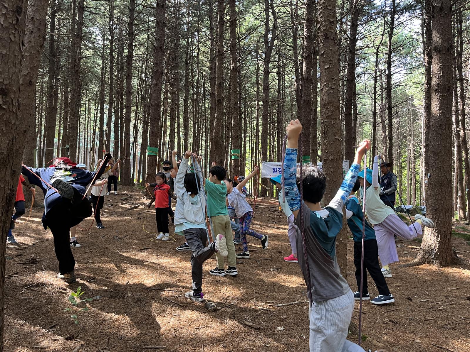 이번에는 숲에서 밧줄놀이를 해봐요! 본격적으로 놀기 전 밧줄을 이용해서 스트레칭을 해요.