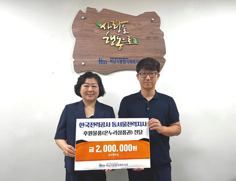 한국전력공사 동서울전력지사 명절지원 전달식 작성일 : 2023.09.20 | 조회수 : 4450 금일 한국전력공사 동서울 전력지사에서 복지관에 온누리 상품권(200만 원)을 전달해주셨습니다. 이날 후원한 상품권으로 경제적으로 어려움을 겪고 있는 하남시 원도심에 사는 취약계층을 위해소중히 사용하겠습니다. 감사합니다!한국전력공사 동서울전력지사는 지역사회 취약계층을 위한 지속적인 사회공헌활동을 전개하고 있습니다.