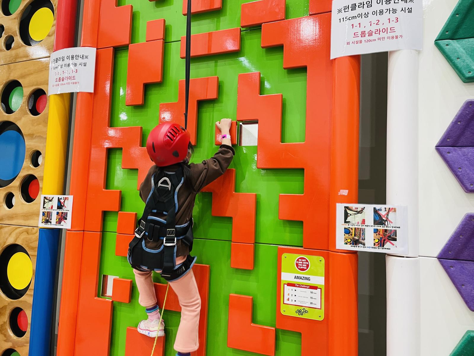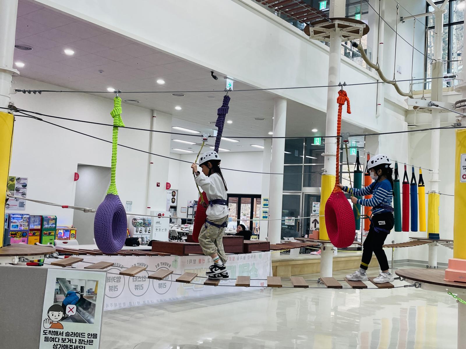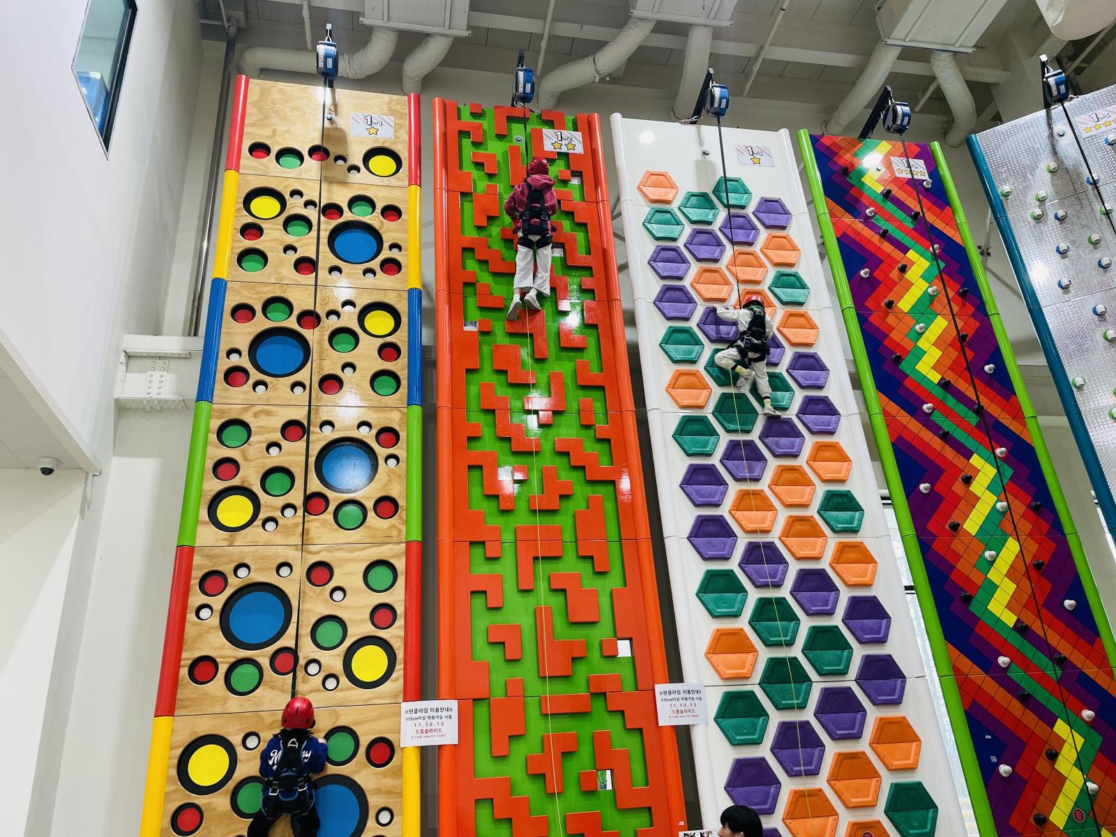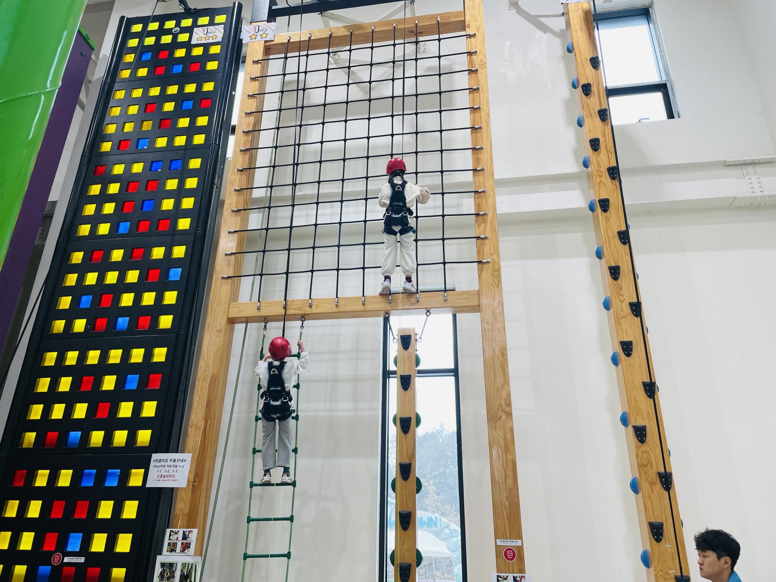 형형색색 정말 멋진 체험존에 가장 꼭대기까지 올라간 용감한 친구들이 보여요!