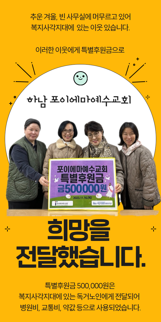 오늘은 노는 날! "친구랑 같이 노는 날" 진행 (3회기) 2023-11-20 조회수 4,494 꿈꾸는아이들 꿈디자이너 보호자모임 5, 6회기 실시 2023-11-20 조회수 4,579 1박 2일 우리가족 힐링데이 2023-11-17 조회수 4,885 [인성놀이] 같이 놀 친구 모여라~! 진행 2023-11-17 조회수 3,776 2023년 하반기 재활치료교육사업 치료사 워크샵 2023-11-16 조회수 4,544 2023 하남먹거리 '식사는 하셨어요?' 24회기 2023-11-16 조회수 3,288 포이에마예수교회 특별후원금 지원 2023-11-15 조회수 3,552 찾아가는 미술관 '아트노마드 예술캠프' 진행 2023-11-10 조회수 5,130 손사랑 나눔 봉사단 11월 둘째 주 활동 2023-11-09 조회수 3,291