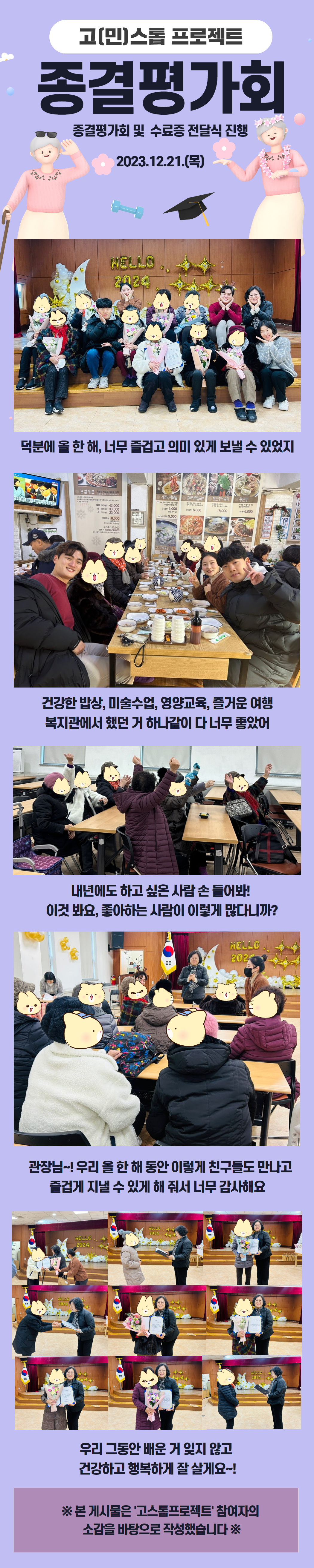2023 내가 여는 스마트 세상 최종 평가회 2023-12-22 조회수 4,359 고스톱 프로젝트 종결평가회 및 수료증 전달식 2023-12-21 조회수 4,085 손사랑 나눔 봉사단 12월 셋째 주 활동 2023-12-21 조회수 4,071 2023 하남먹거리 '식사는 하셨어요?' 28회기 2023-12-21 조회수 4,619 폐현수막 새활용 프로젝트 '보따리 봉사단' 12월 3주차 활동 2023-12-20 조회수 4,106 덕풍3동 행복마을관리소 연계 '찾아가는 지역주민 교육' 2023-12-15 조회수 4,874 손사랑 나눔 봉사단 12월 둘째 주 활동 2023-12-14 조회수 4,036 2023 하남먹거리 '식사는 하셨어요?' 27회기 2023-12-14 조회수 2,487 2023년 가족문화체험활동 (잠실 롯데월드) 2023-12-14 조회수 4,409