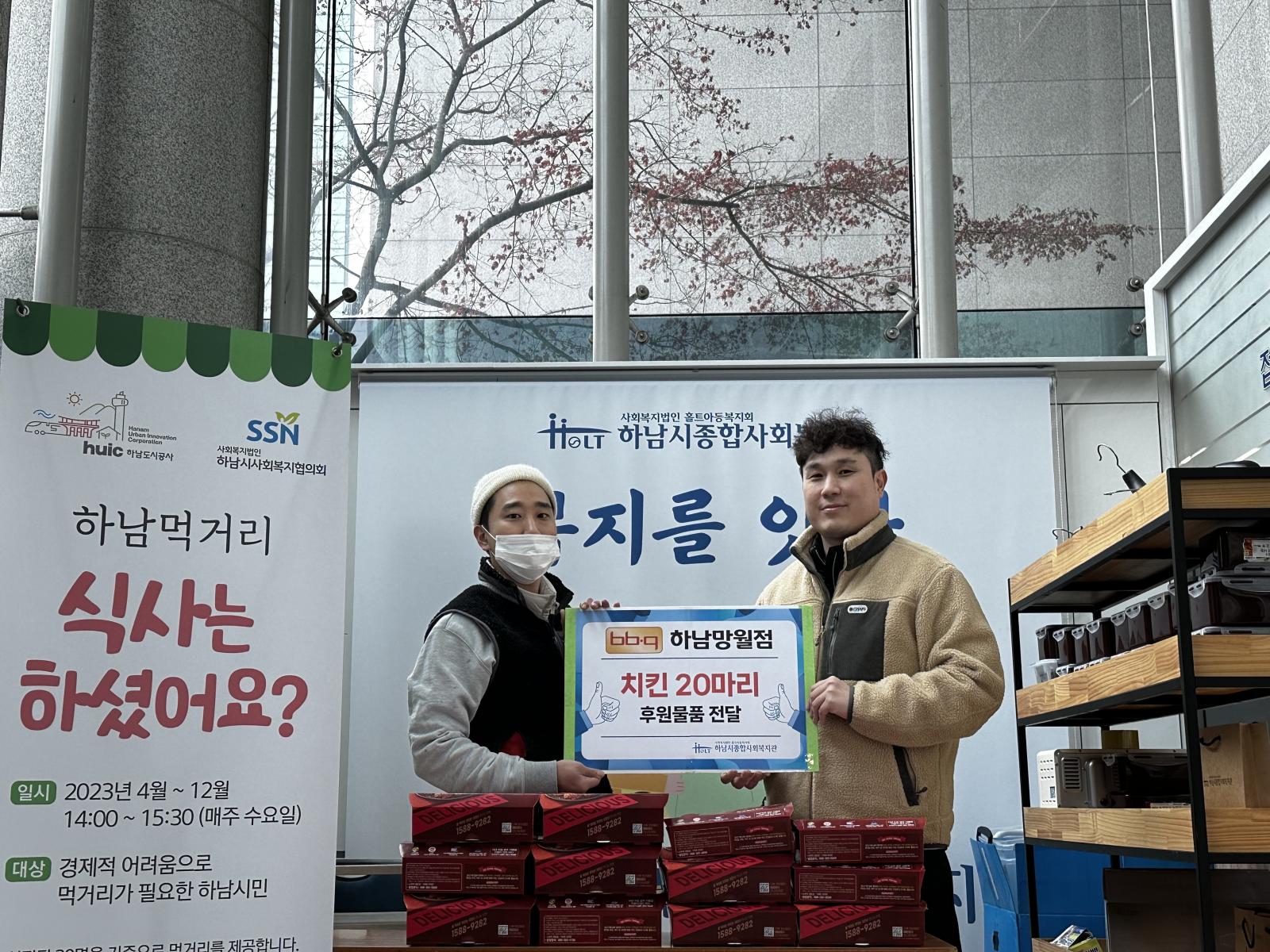 BBQ치킨 하남망월점 후원물품 지원 작성일 : 2023.11.08 | 조회수 : 2881 금일 BBQ치킨 하남망월점에서 치킨 20마리를 후원해주셨습니다.젊은 사장님의 정성어린 마음으로 조리한 따뜻한 치킨은당일 지역사회 어르신들에게 잘 전달되었습니다.행복한 나눔이 계속 이어지길 바랍니다. 감사합니다!!