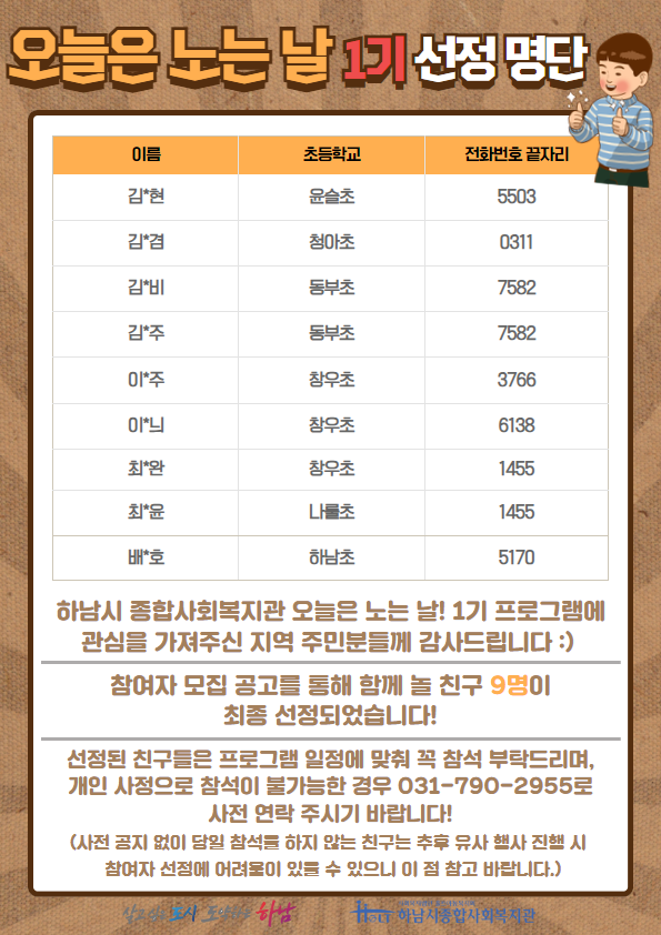 [오늘은 노는 날! - 1기] 최종 선정 명단 작성일 : 2024.04.01 | 조회수 : 3313 안녕하세요. 하남시종합사회복지관입니다 :)'오늘은 노는 날! - 1기' 참여하는 친구들 최종 선정 명단을 공지합니다!4~5월에 함께 만나요!문의) 최유리 사회복지사 031-790-2955