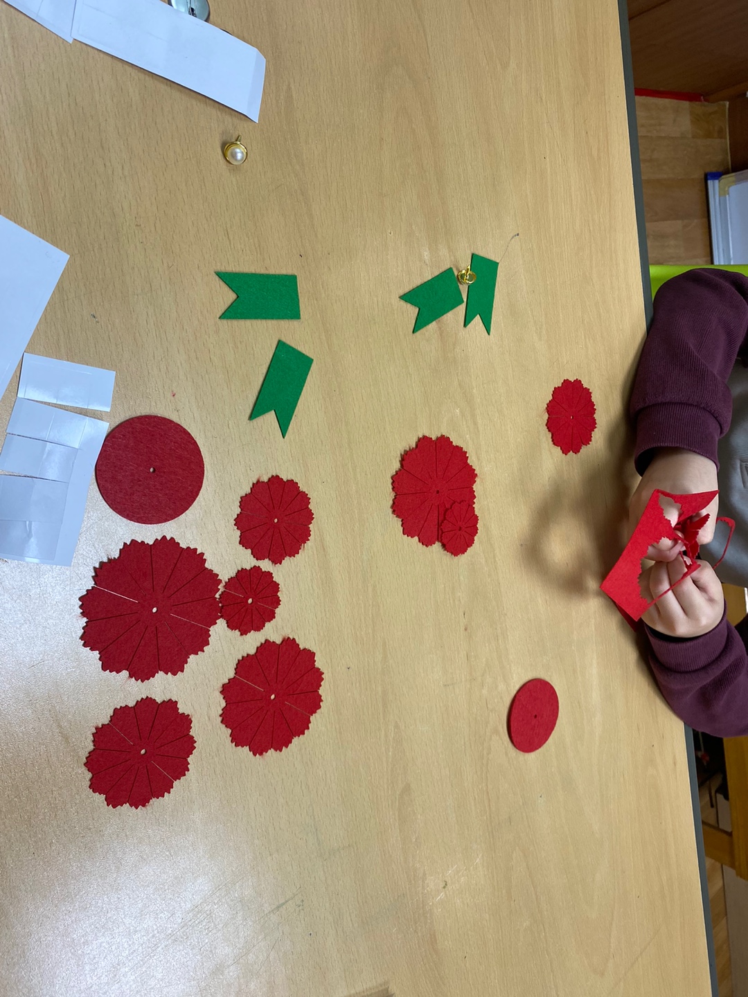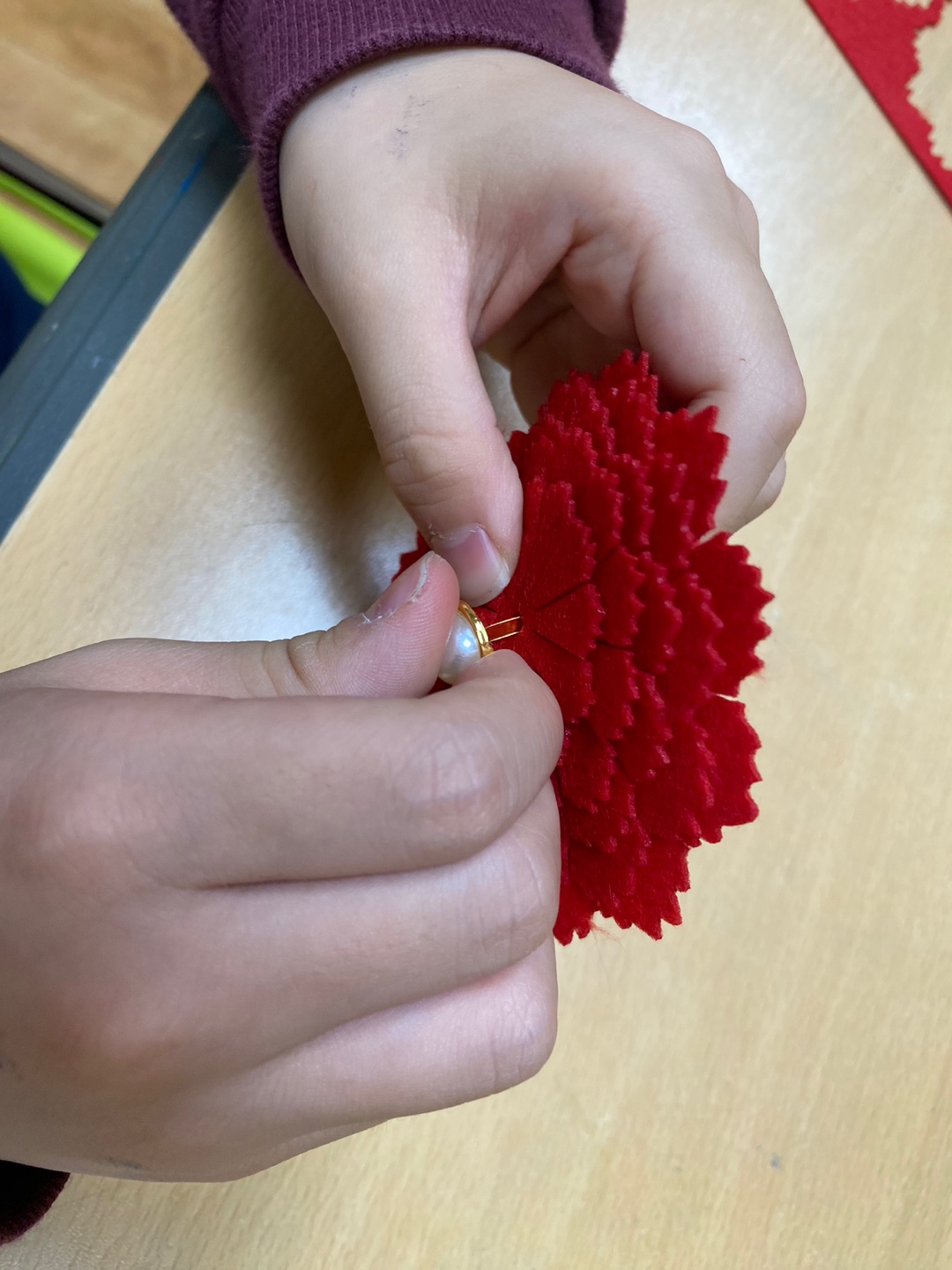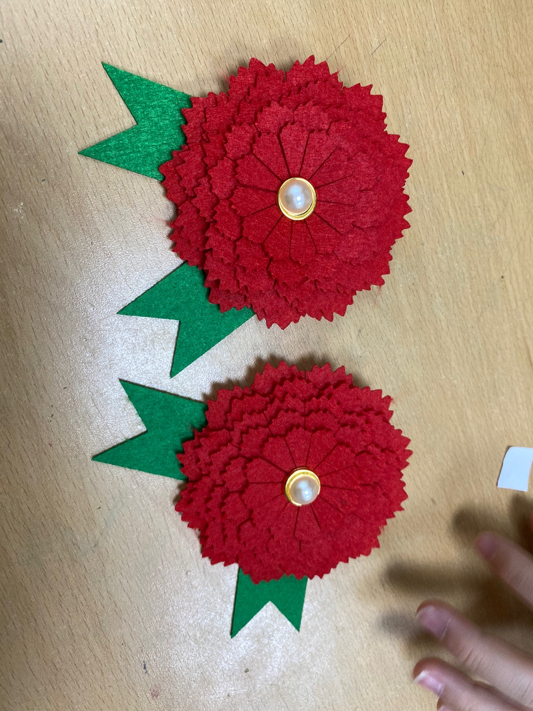 펠트 카네이션 꽃잎을 손으로 뜯고, 진주 장식을 끼우고, 잎을 붙이고
