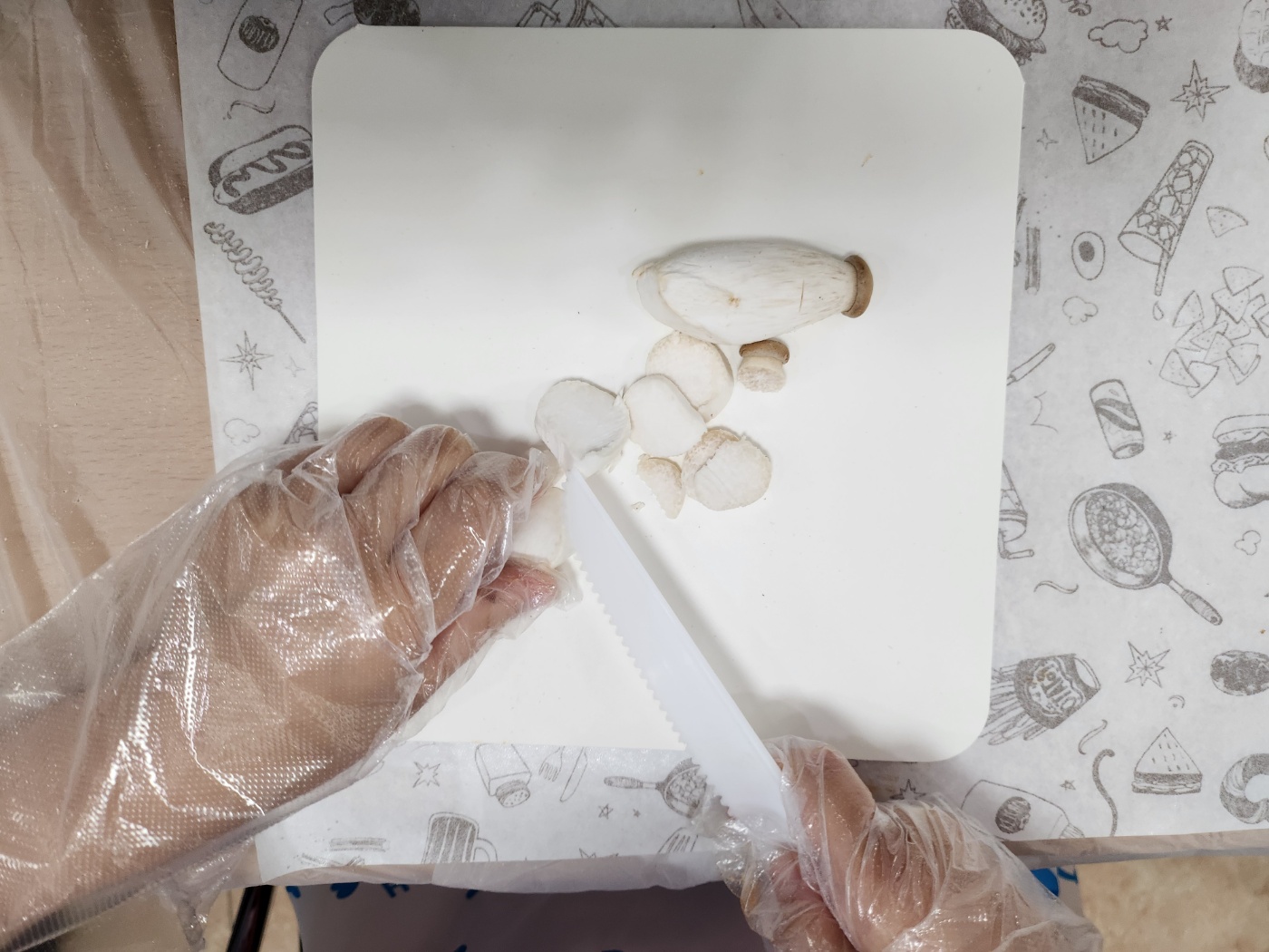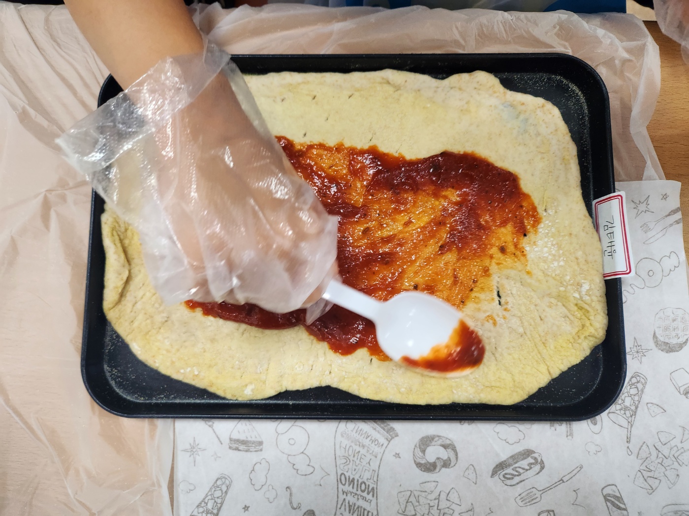 반죽을 밀대로 밀고, 소스를 바르고,