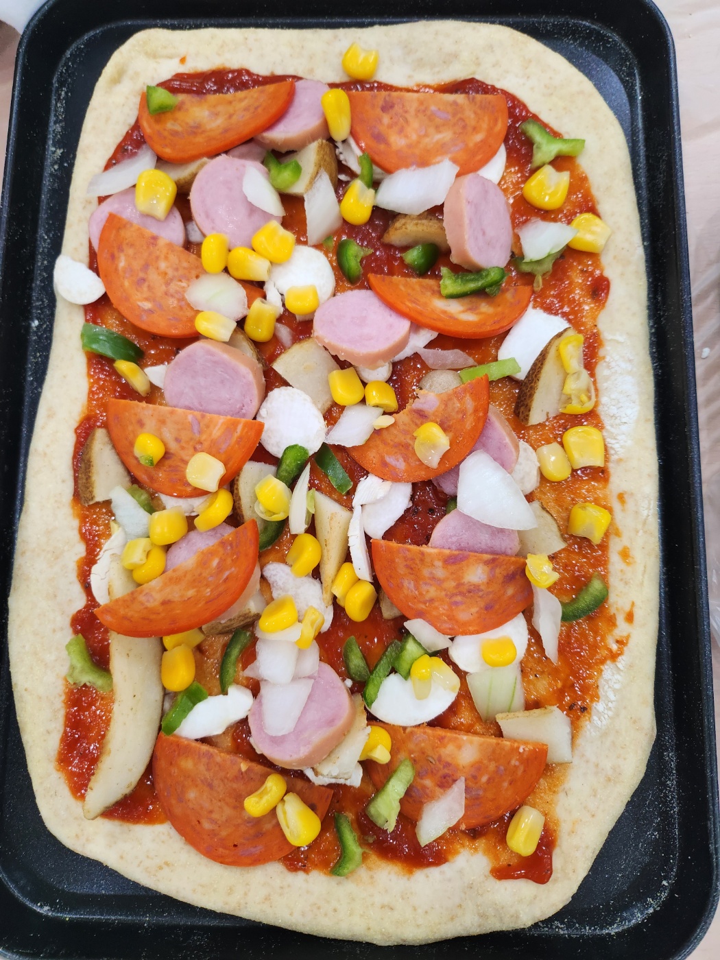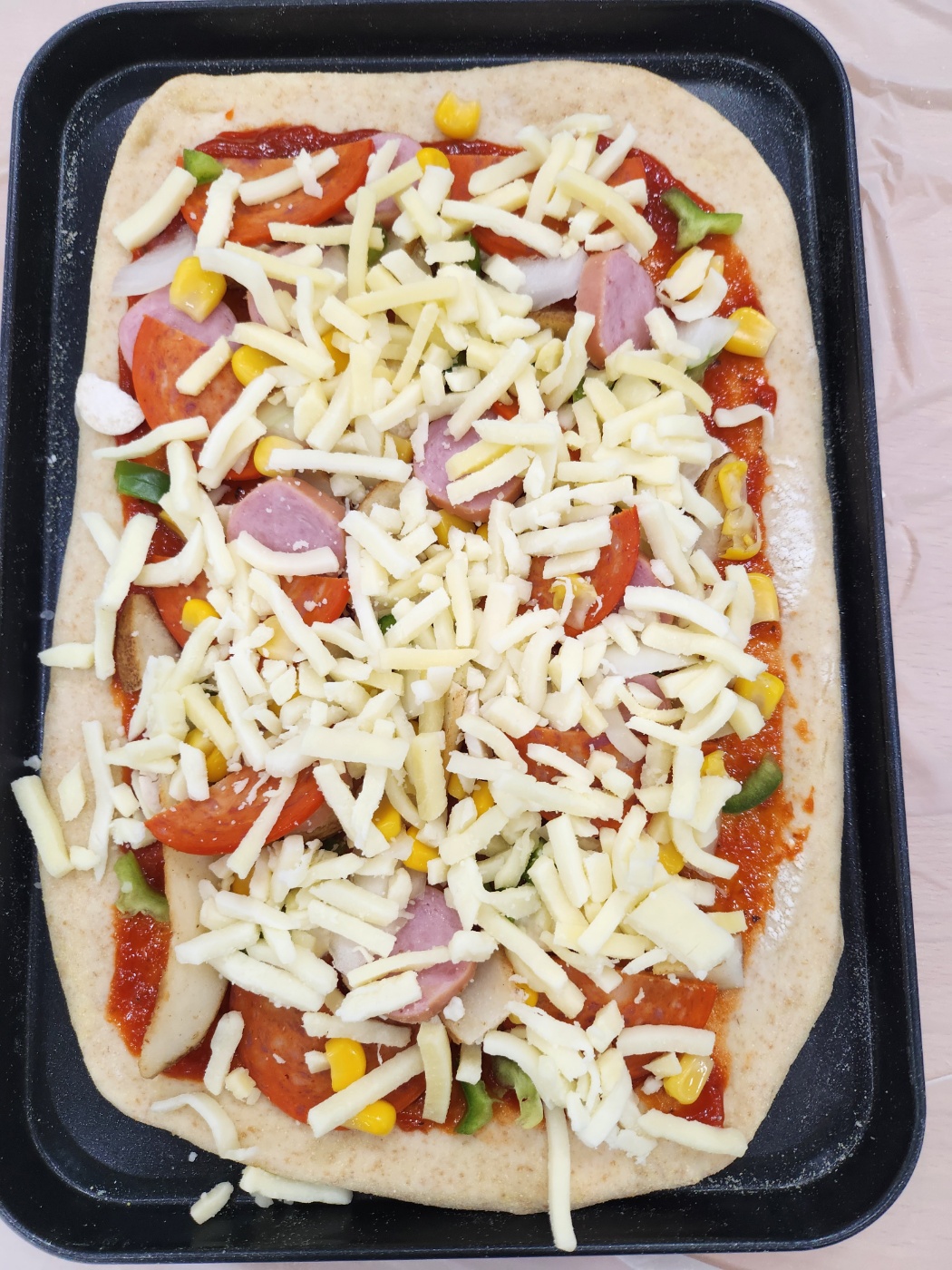 치즈까지 뿌려준 후 오븐에 넣고 맛있는 피자를 되길 기다립니다.