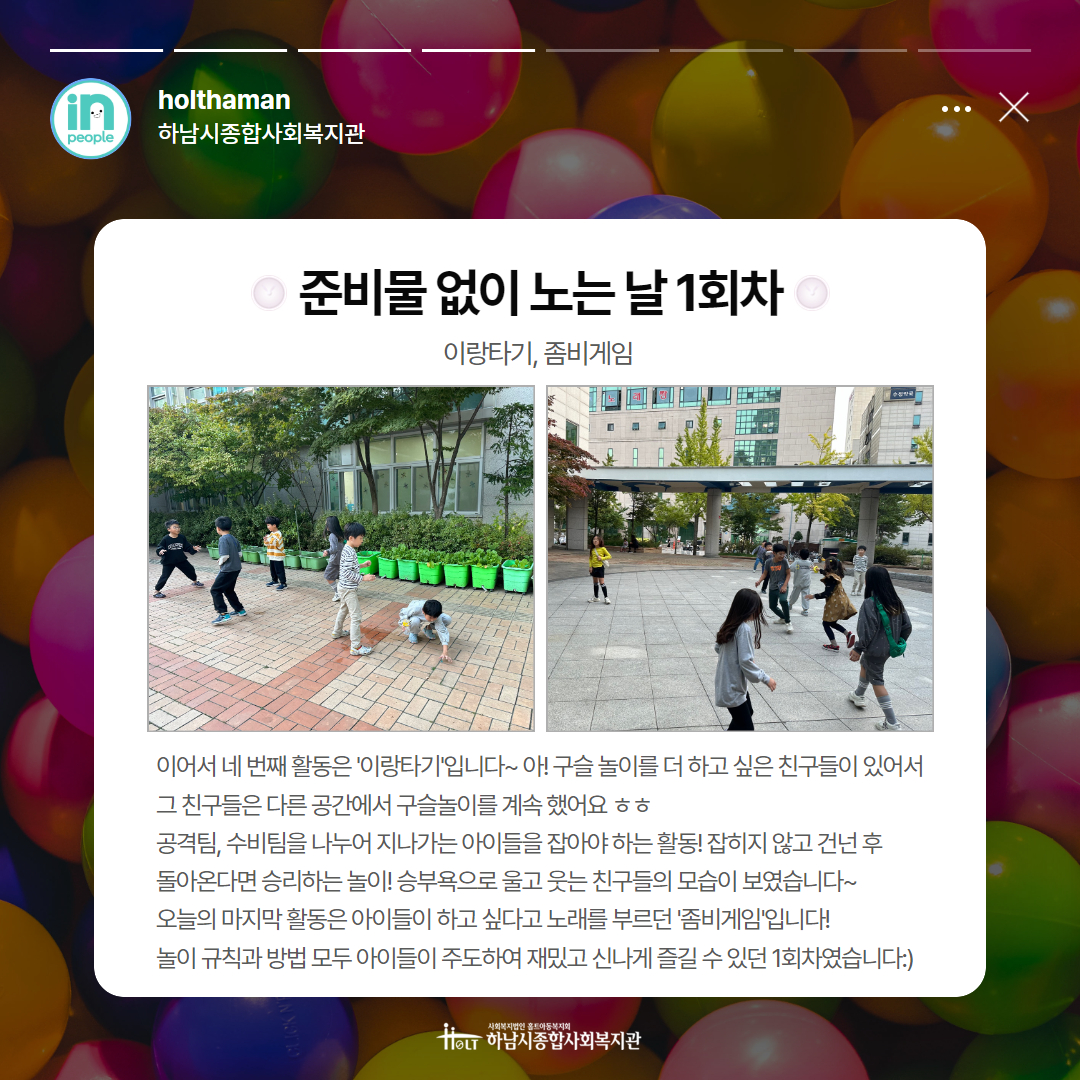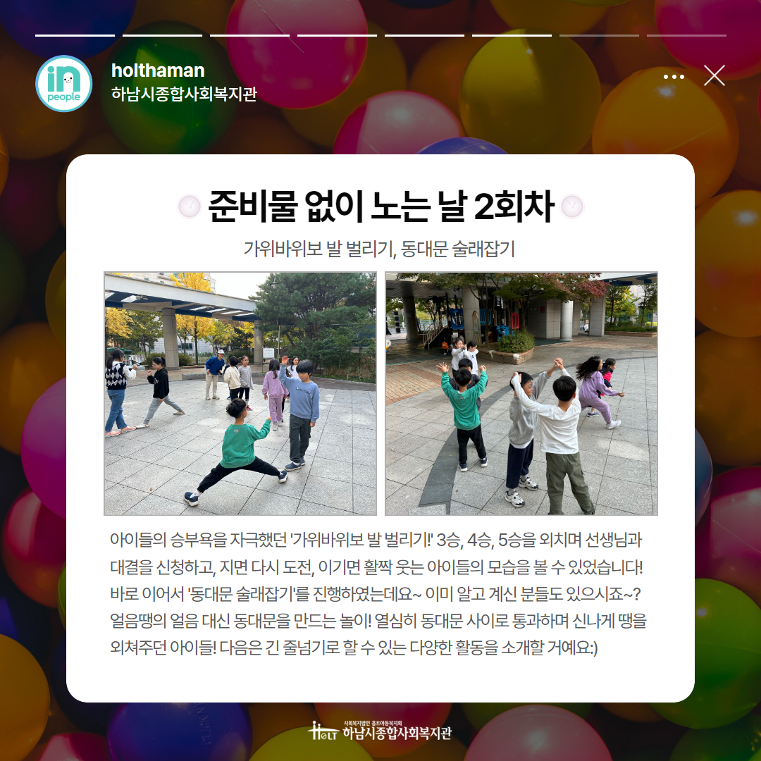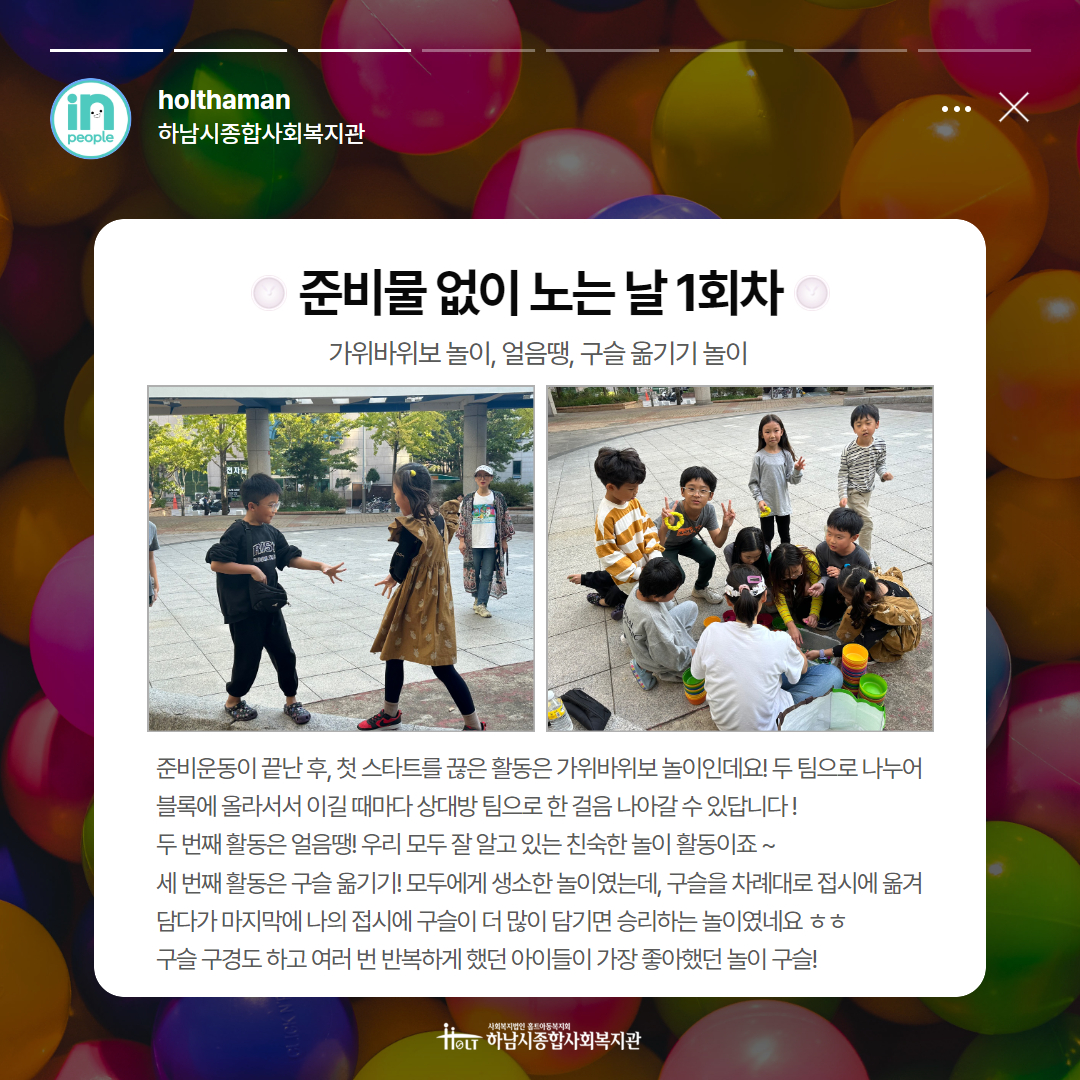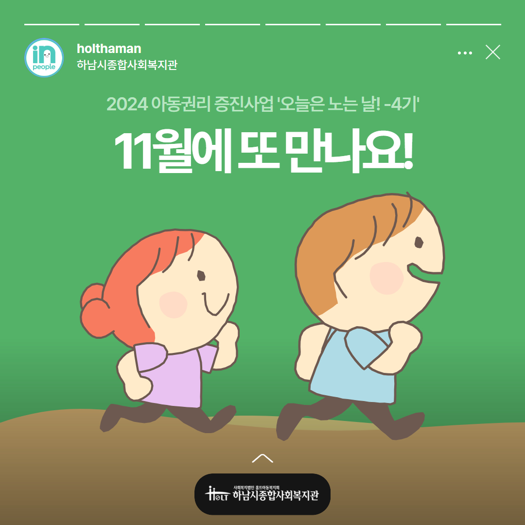고(독사)스톱 프로젝트(스타필드하남, 하남시사회복지협의회) 2024-11-14 조회수 1,749 제철과일 구독 프로젝트 6(우양재단) 2024-11-11 조회수 1,899 어르신 외식지원사업 '방방곡곡 행복밥상' (KBS강태원복지재단) 2024-11-06 조회수 2,170 2024 꿈디자이너 보호자모임 5회기 실시 2024-11-06 조회수 1,628 1박 2일 가족 힐링캠프 실시 2024-11-05 조회수 1,823 꿈나무나눔실천교실-나눔증서만들기 2024-11-05 조회수 1,617 사람과 사람 사이를 잇다 ‘사이사이’ 네트워크 회의 실시(2회기) 2024-11-04 조회수 2,012 2024 아동권리 증진사업 '오늘은 노는 날! - 4기' 10월 소식 2024-11-01 조회수 1,796 사람과 사람 사이를 잇다 ‘사이사이’ 정서지원 프로그램(가을 나들이) 2024-11-01 조회수 1,423