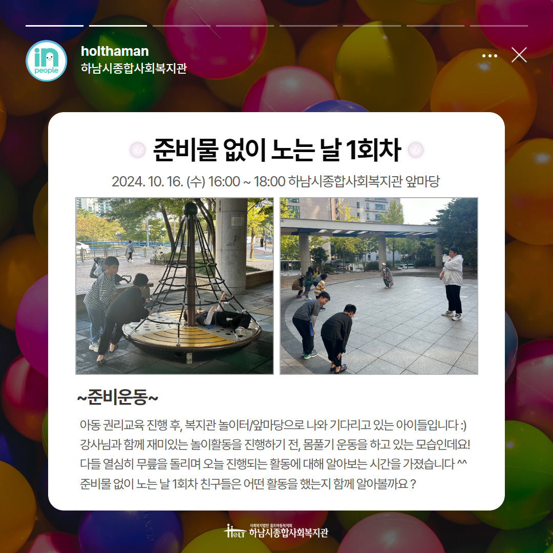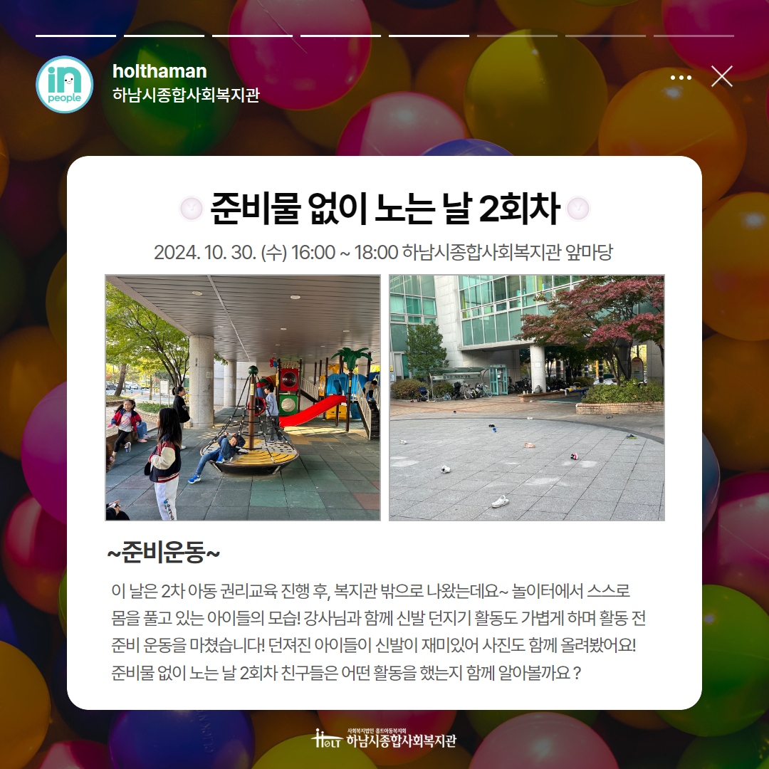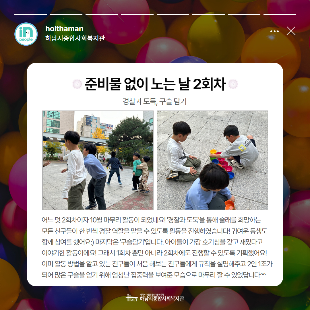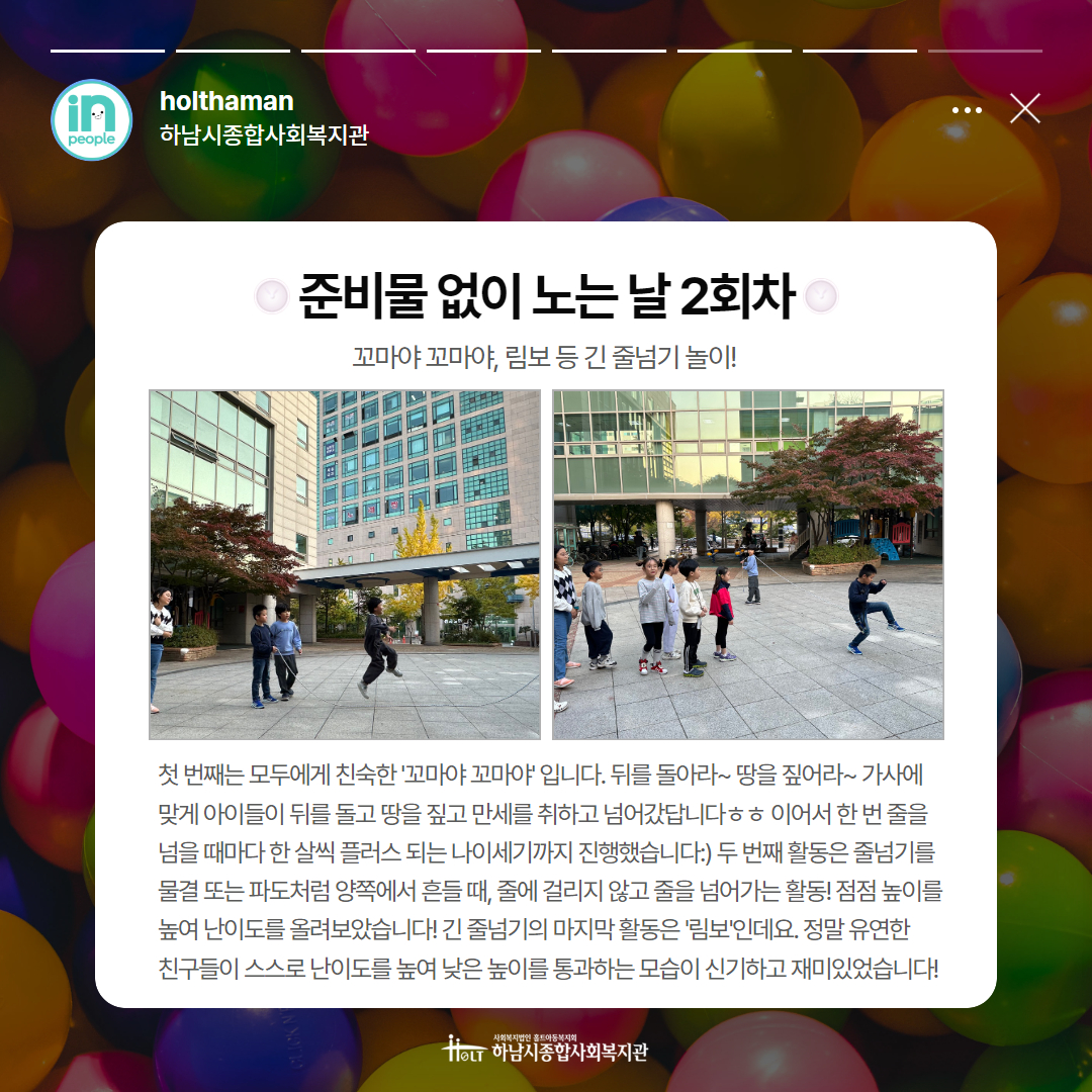 고(독사)스톱 프로젝트(스타필드하남, 하남시사회복지협의회) 2024-11-14 조회수 1,749 제철과일 구독 프로젝트 6(우양재단) 2024-11-11 조회수 1,899 어르신 외식지원사업 '방방곡곡 행복밥상' (KBS강태원복지재단) 2024-11-06 조회수 2,170 2024 꿈디자이너 보호자모임 5회기 실시 2024-11-06 조회수 1,628 1박 2일 가족 힐링캠프 실시 2024-11-05 조회수 1,823 꿈나무나눔실천교실-나눔증서만들기 2024-11-05 조회수 1,617 사람과 사람 사이를 잇다 ‘사이사이’ 네트워크 회의 실시(2회기) 2024-11-04 조회수 2,012 2024 아동권리 증진사업 '오늘은 노는 날! - 4기' 10월 소식 2024-11-01 조회수 1,796 사람과 사람 사이를 잇다 ‘사이사이’ 정서지원 프로그램(가을 나들이) 2024-11-01 조회수 1,423