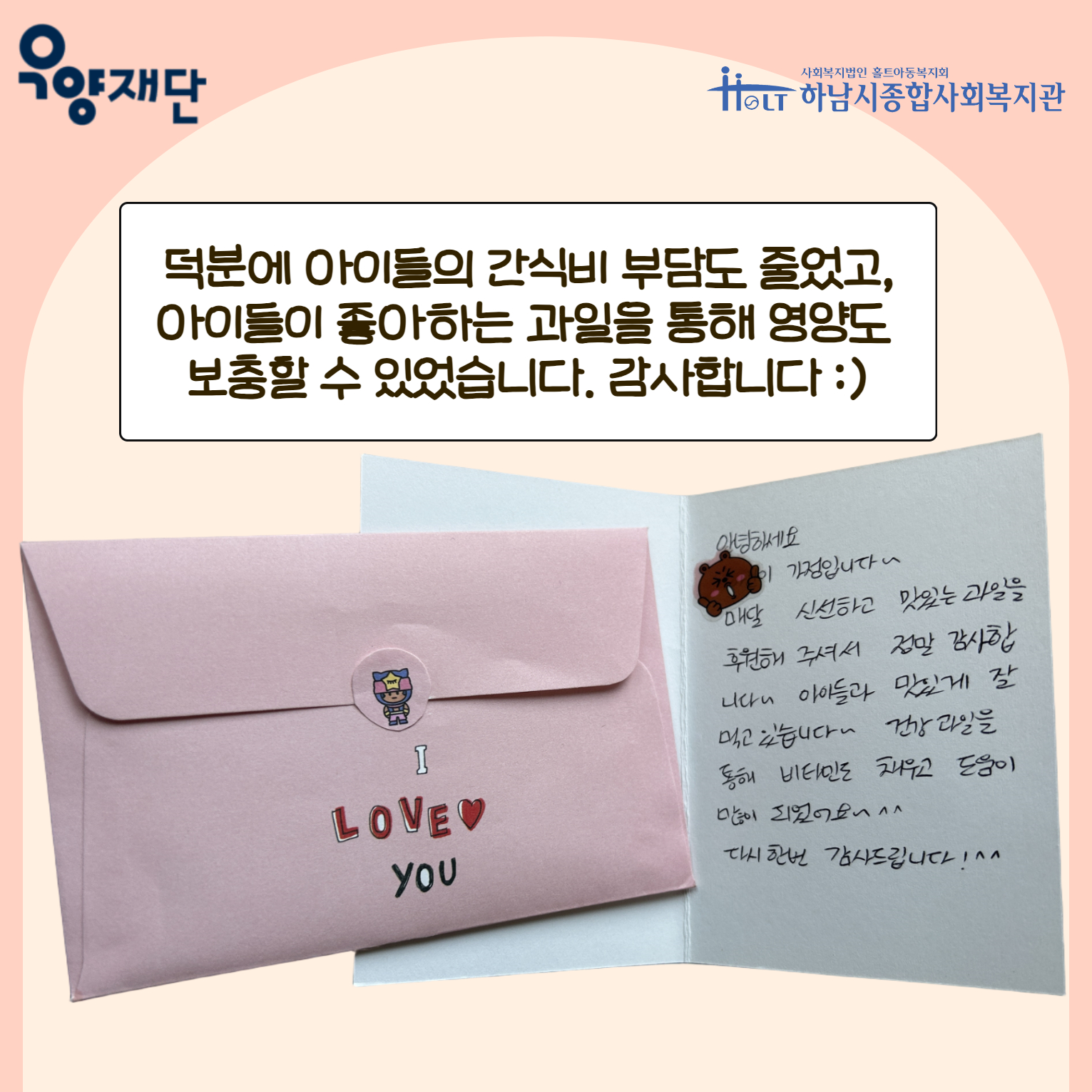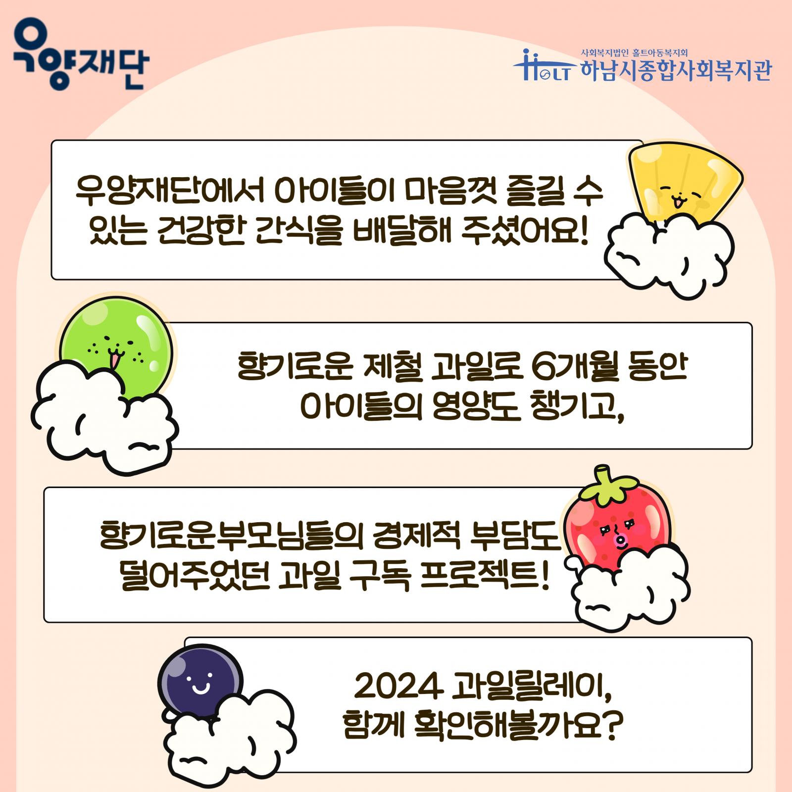 고(독사)스톱 프로젝트(스타필드하남, 하남시사회복지협의회) 2024-11-14 조회수 1,749 제철과일 구독 프로젝트 6(우양재단) 2024-11-11 조회수 1,900 어르신 외식지원사업 '방방곡곡 행복밥상' (KBS강태원복지재단) 2024-11-06 조회수 2,170 2024 꿈디자이너 보호자모임 5회기 실시 2024-11-06 조회수 1,628 1박 2일 가족 힐링캠프 실시 2024-11-05 조회수 1,823 꿈나무나눔실천교실-나눔증서만들기 2024-11-05 조회수 1,617 사람과 사람 사이를 잇다 ‘사이사이’ 네트워크 회의 실시(2회기) 2024-11-04 조회수 2,012 2024 아동권리 증진사업 '오늘은 노는 날! - 4기' 10월 소식 2024-11-01 조회수 1,796 사람과 사람 사이를 잇다 ‘사이사이’ 정서지원 프로그램(가을 나들이) 2024-11-01 조회수 1,423