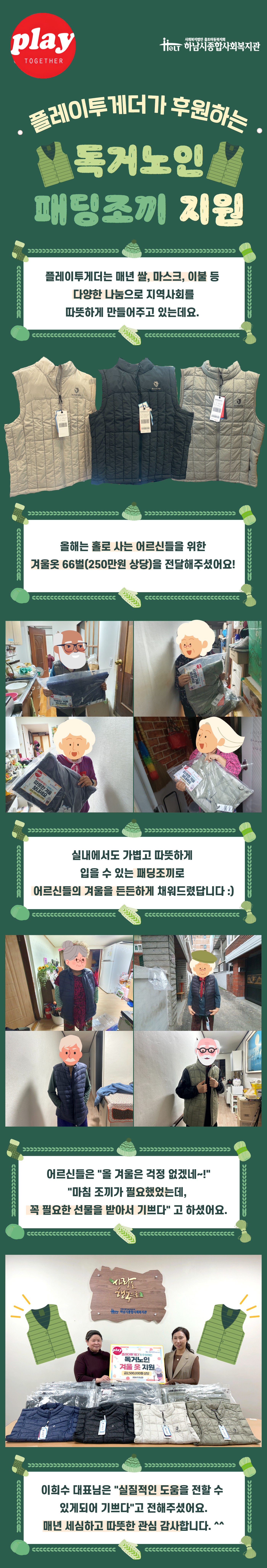 2024 요리체험프로그램 과일청, 크로플 만들기 2024-11-28 조회수 1,905 2024 하남먹거리 '식사는 하셨어요?' (11월 조리봉사 & 배분봉사) 2024-11-27 조회수 1,549 어르신 달걀지원사업(우양재단) 2024-11-27 조회수 1,637 사람과 사람 사이를 잇다 ‘사이사이’ 홍보 및 지역사회 인식 캠페인 진행 2024-11-27 조회수 1,126 2024 꿈디자이너 비전원정대 6회기 실시 2024-11-26 조회수 1,686 경기도의회 윤태길 의원, 안전한 복지환경 조성 기여 감사장 수상 2024-11-25 조회수 1,481 독거노인을 위한 패딩조끼 지원(플레이투게더) 2024-11-22 조회수 1,697 "AP NOW! 적극적 부모역할훈련" 2024-11-15 조회수 1,977 2024 하남시민 행복축제 '걷다, 덕풍천' 현장 스케치 2024-11-15 조회수 1,708