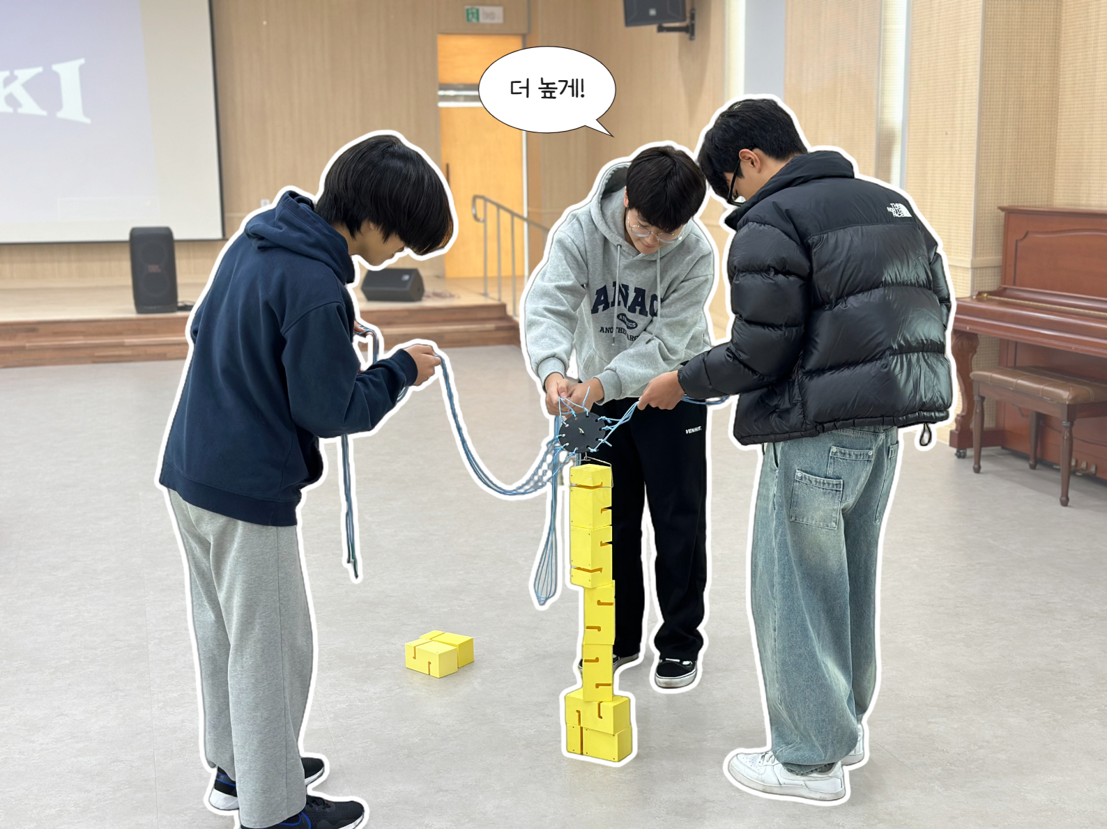 함께 힘을 합쳐 고리에 블럭을 연결해서 차곡차곡 탑을 쌓으며