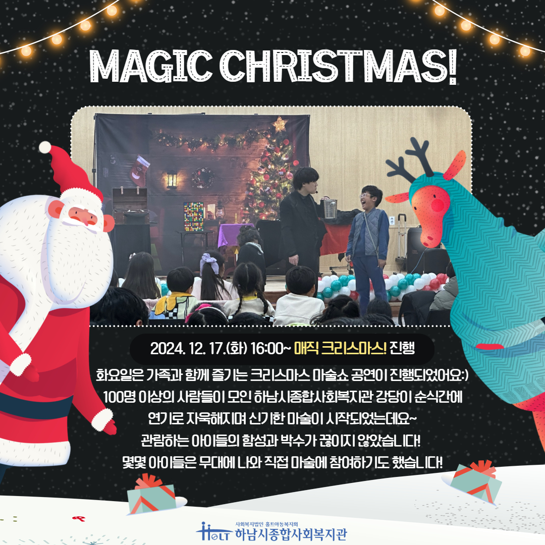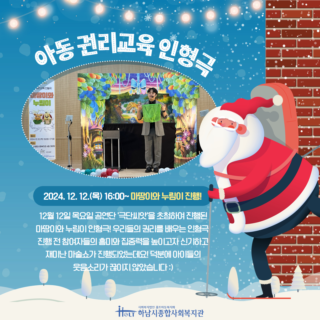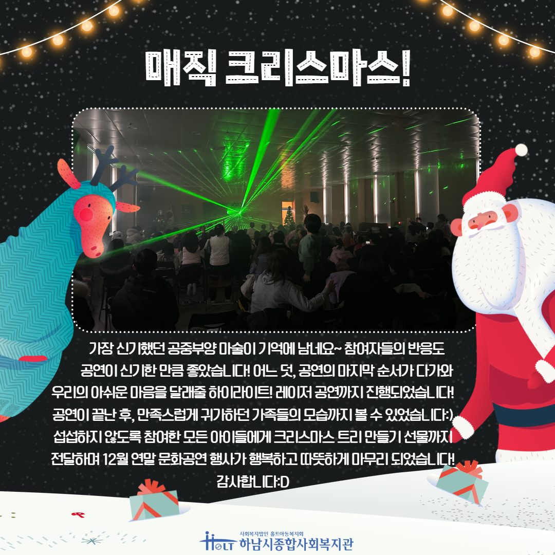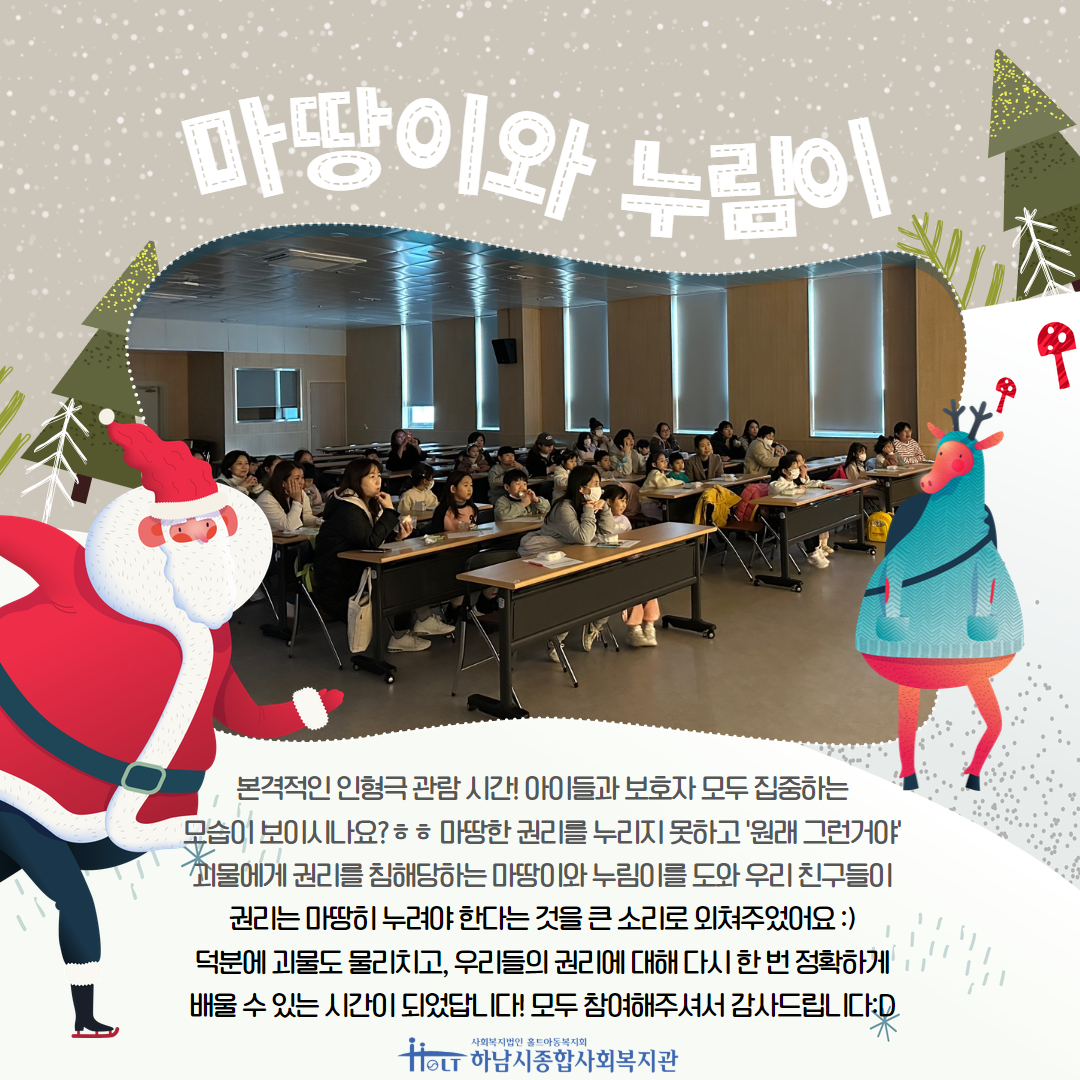 2024 가족문화행사 '12월 연말 행사' 진행 2024-12-19 조회수 1,482 2024 후원자·자원봉사자의 밤 '세상을 밝히는 빛' 현장스케치 2024-12-13 조회수 1,764 2024 꿈디자이너 보호자모임 6회기 실시 2024-12-11 조회수 1,492 오븐엔조이 파운터코리아반 12월 제과제빵 후원 2024-12-10 조회수 1,069 2024년 하남도시공사와 함께하는 '사랑의 연탄' 지원사업 2024-12-06 조회수 1,997 사람과 사람 사이를 잇다 ‘사이사이’ 네트워크 회의 실시(3회기) 2024-12-05 조회수 1,243 한국자유총연맹 하남시지회 청년회, 하남시 취약계층 어르신을 위한 쌀과자 2024-12-02 조회수 1,515 2024 아동권리 증진사업 '오늘은 노는 날! - 4기' 10월 소식 2024-11-29 조회수 1,683 2024년 3차 부모교육 '학교폭력, 소통하는 부모' 2024-11-29 조회수 1,726