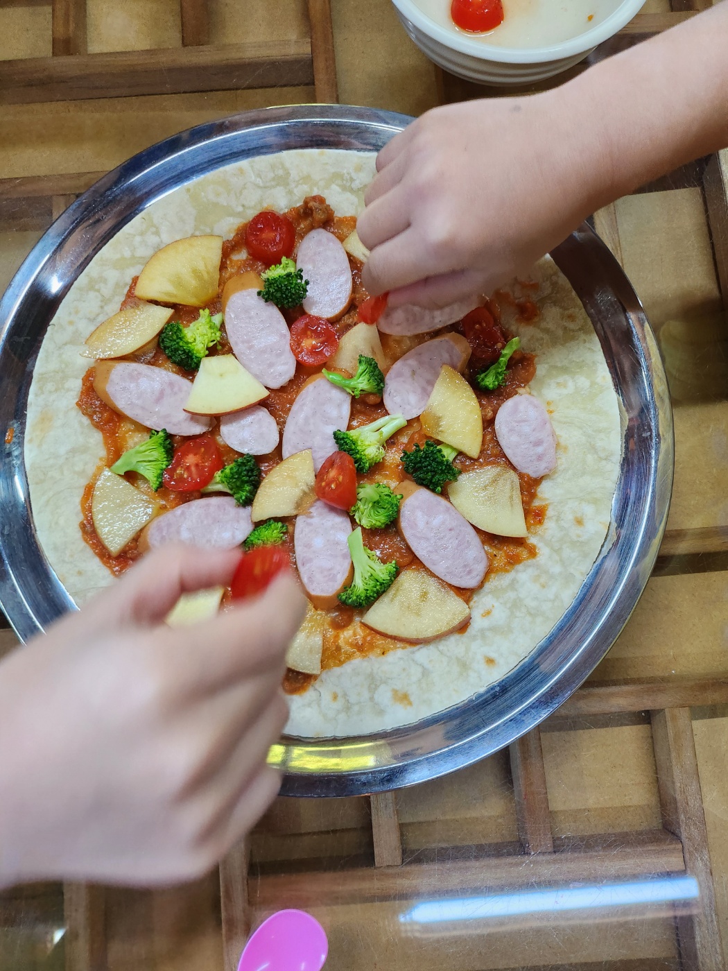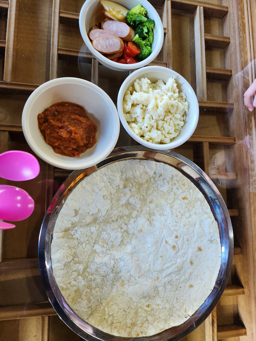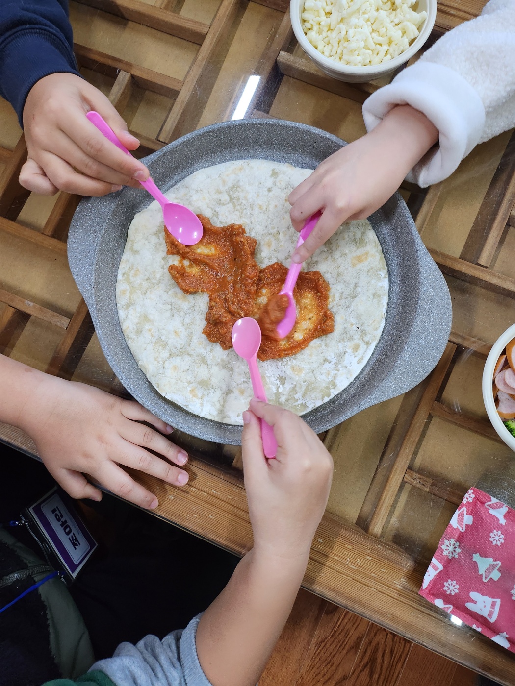 한옥집으로 이동하여 오늘의 간식 피자 만들기를 시작하였습니다.