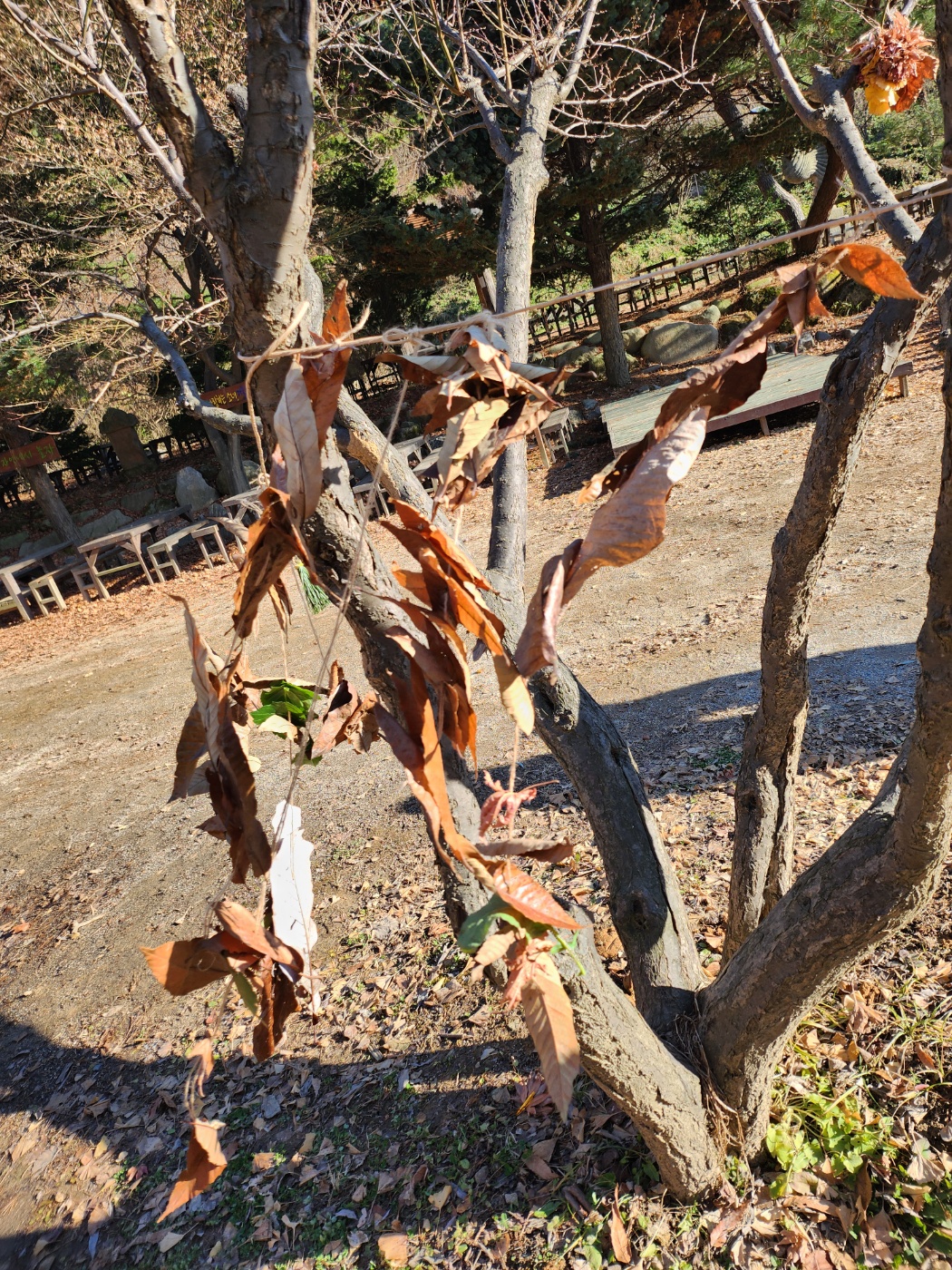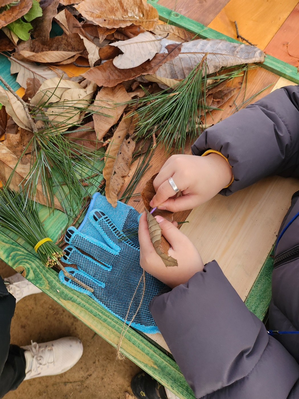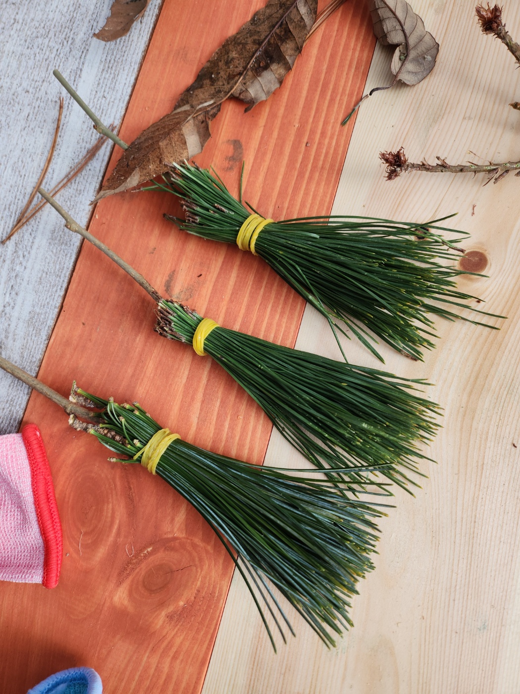 마지막으로 숲에서 주워온 낙엽과 솔잎으로 낙엽 커튼과 솔잎 빗자루를 만들었습니다.