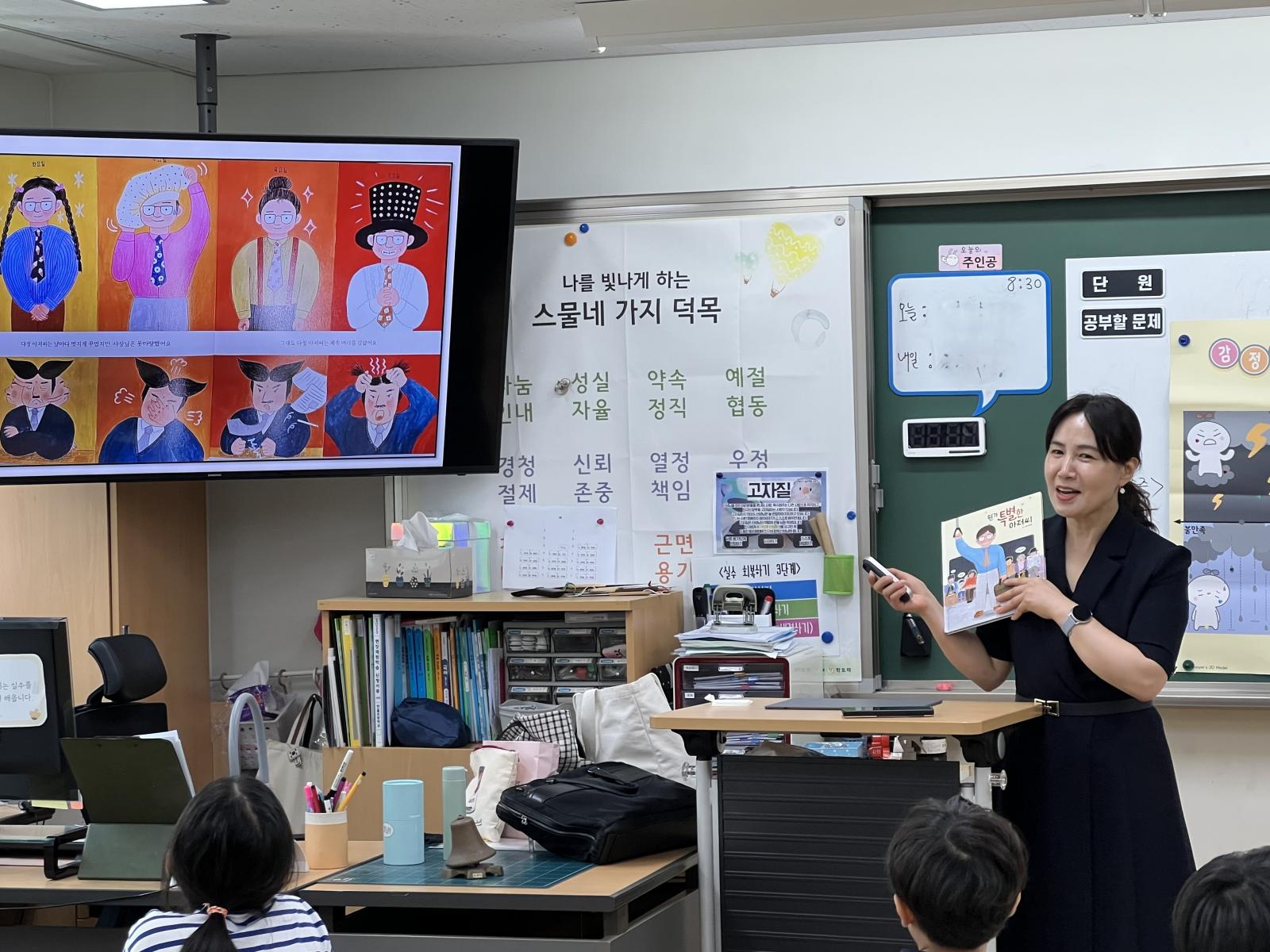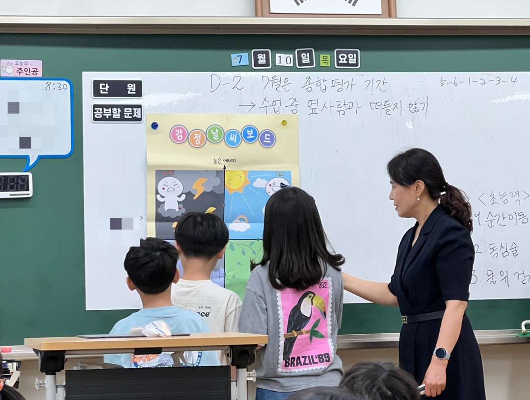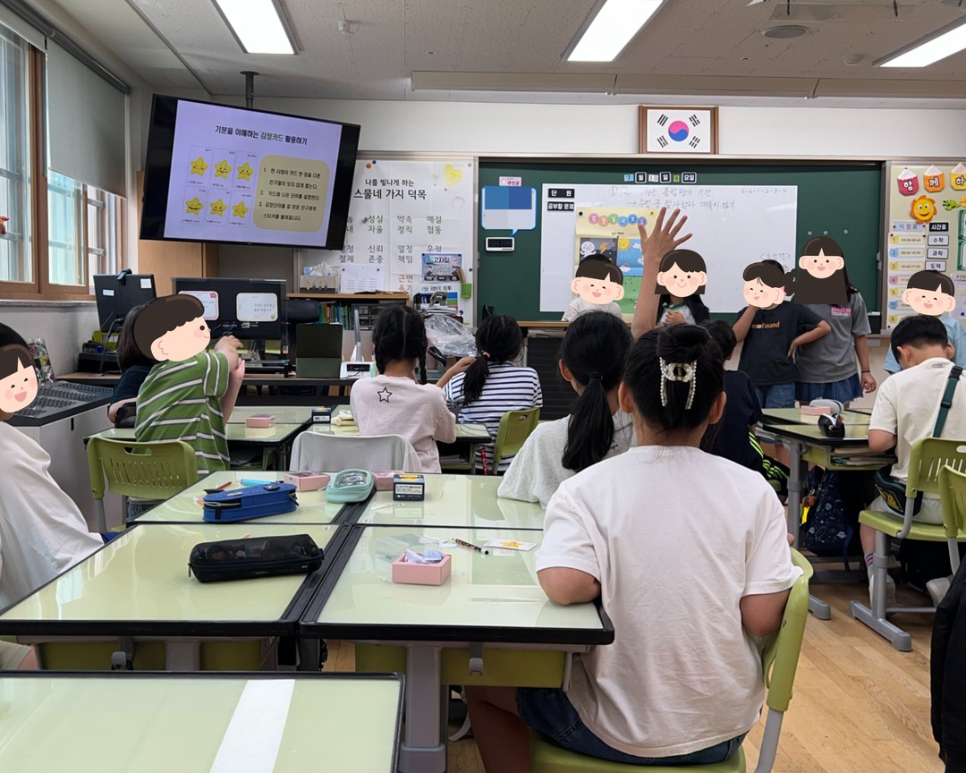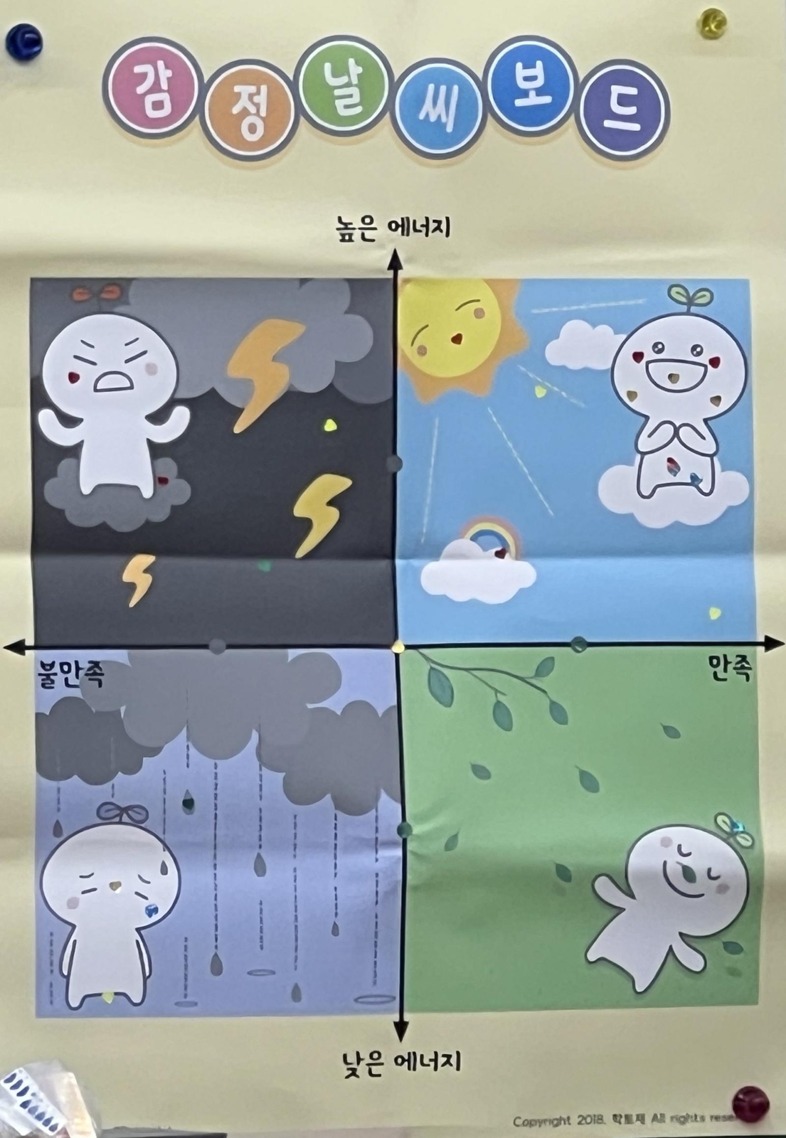 수업은 감정날씨보드를 활용해 오늘 반 친구들의 감정을 체크해보는 활동으로 시작되었으며,