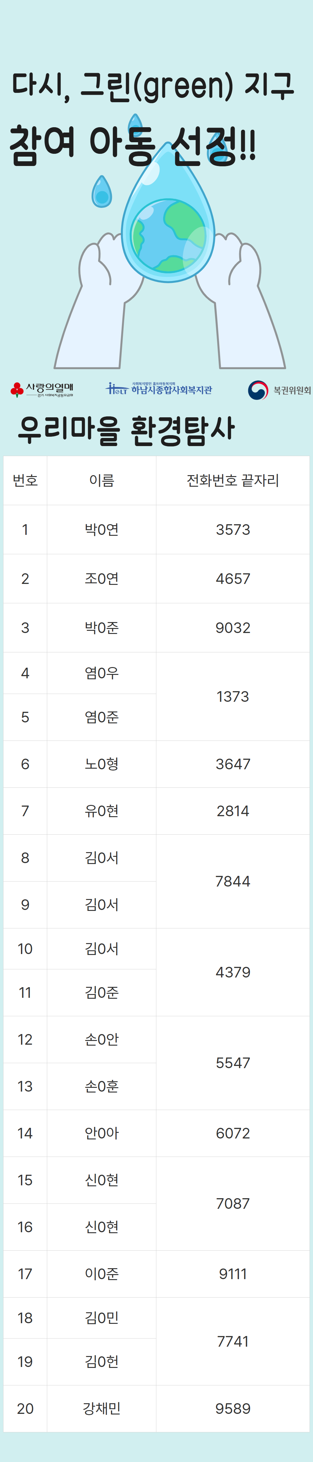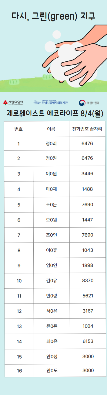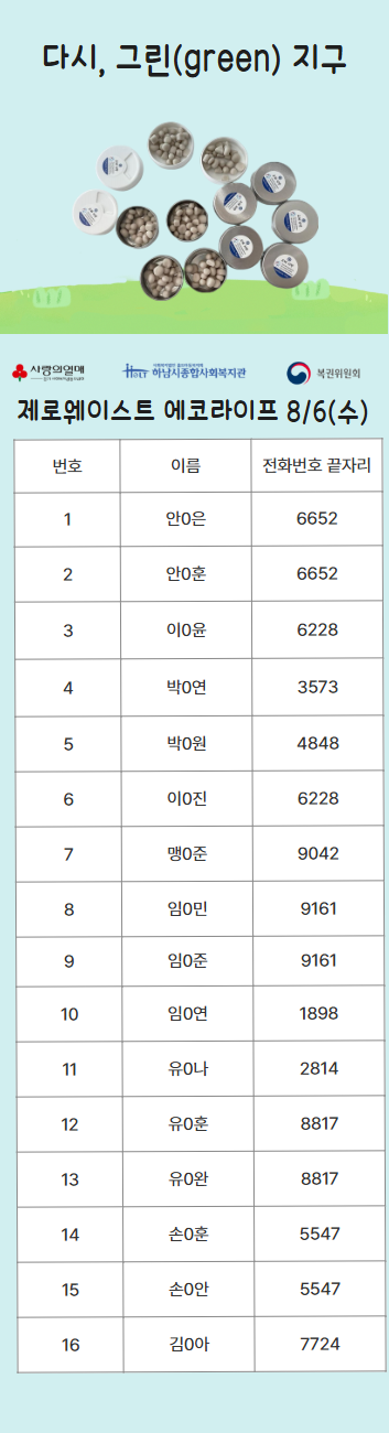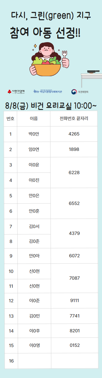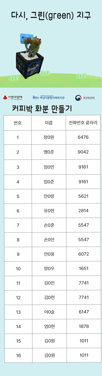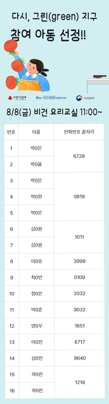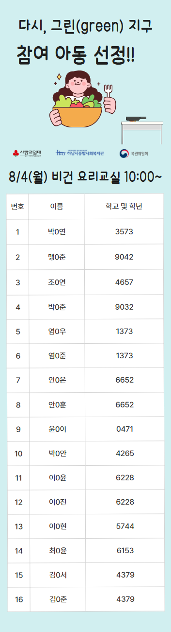 2025년 다시, 그린(green) 지구 복지관 참여자 선정 명단 공개 작성일 : 2025.07.29 | 조회수 : 838 * 비어있는 자리는 아직 추가 모집을 받고 있으니 신청해주세요!~ (신청하실 때 1인당 프로그램 3개로 제한되어 있으니, 잘 확인해주세요!)