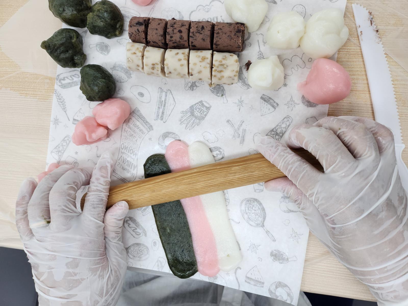 부모님들과 함께 떡을 밀대로 밀고 안에 고물을 넣은 후