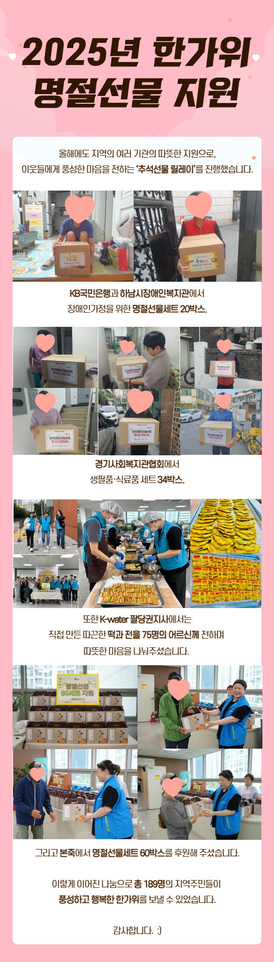 2025 가족체험행사 '한가위 강정만들기' 2025-10-01 조회수 648 2025 한가위 명절 선물 릴레이 2025-10-01 조회수 426 하남시종합사회복지관 찾아가는 주민교육 프로그램 '성장하남' 진행(9월) 2025-10-01 조회수 471 따뜻함을 나누는 봉사단: 가을 나들이 2025-09-30 조회수 527 사례관리 팀스터디 5회기 실시 2025-09-29 조회수 345 2025년 사람과 사람 사이를 잇다 ‘사이사이’ 정서지원 원예활동 2025-09-25 조회수 499 2025년 LH하남권 주거복지지사와 함께 하는 취약계층 식품키트 지원 2025-09-25 조회수 763 청장년 1인 가구 밥상지원 ‘같이혼밥’ 대면교육(12기) 2025-09-24 조회수 359 우양이네 밥차와 함께하는 한가위 한마당(우양재단, 본죽, 2층에 사진관) 2025-09-24 조회수 277