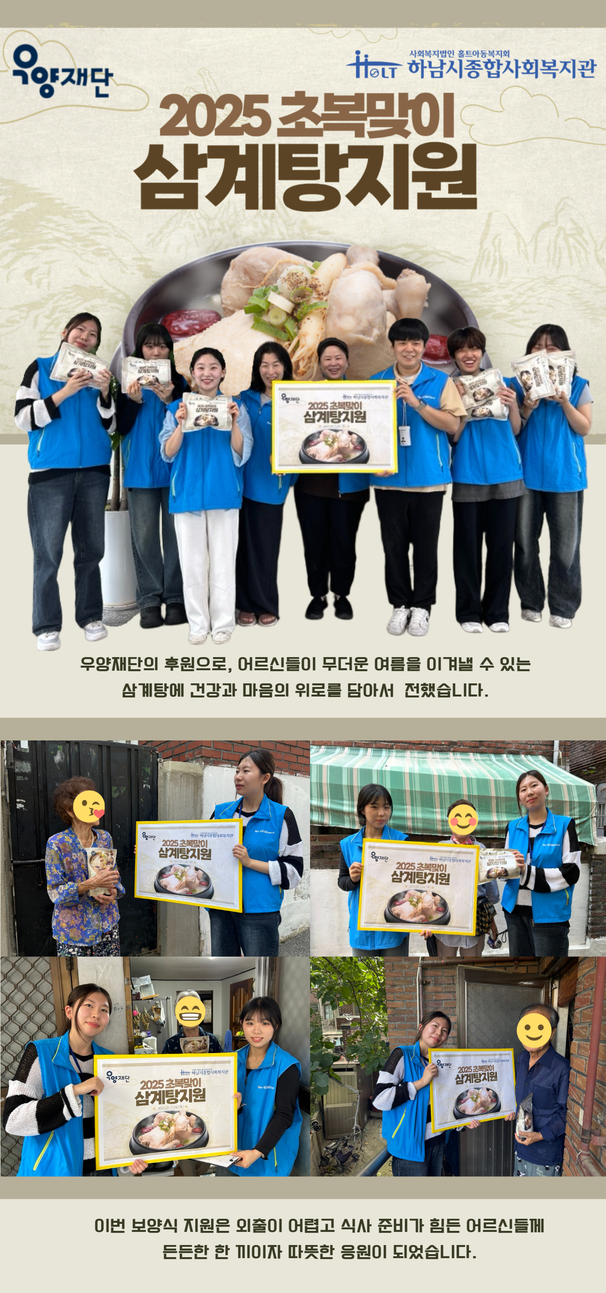 2025년 7월 행복나눔조리봉사단 활동 진행(하남먹거리 식사는 하셨어요? 2025-07-25 조회수 681 2025 초복삼계탕 지원(우양재단) 2025-07-25 조회수 329 2025 꿈디자이너 비전원정대 4회기 실시 2025-07-25 조회수 699 2025 꿈디자이너 비전원정대 3회기 실시 2025-07-25 조회수 874 다시, 그린(green) 지구 4단지 참여자 선정! 2025-07-23 조회수 764 2025년 초복 맞이 재가노인 식사배달 진행 2025-07-22 조회수 773 (느린학습자)일상생활적응행동척도검사 2025-07-17 조회수 906 2025년 폐현수막 새활용 프로젝트 <보따리 봉사단> 7월 활동 2025-07-17 조회수 778 오븐엔조이 파운터코리아반 7월 제과제빵 후원 2025-07-16 조회수 485