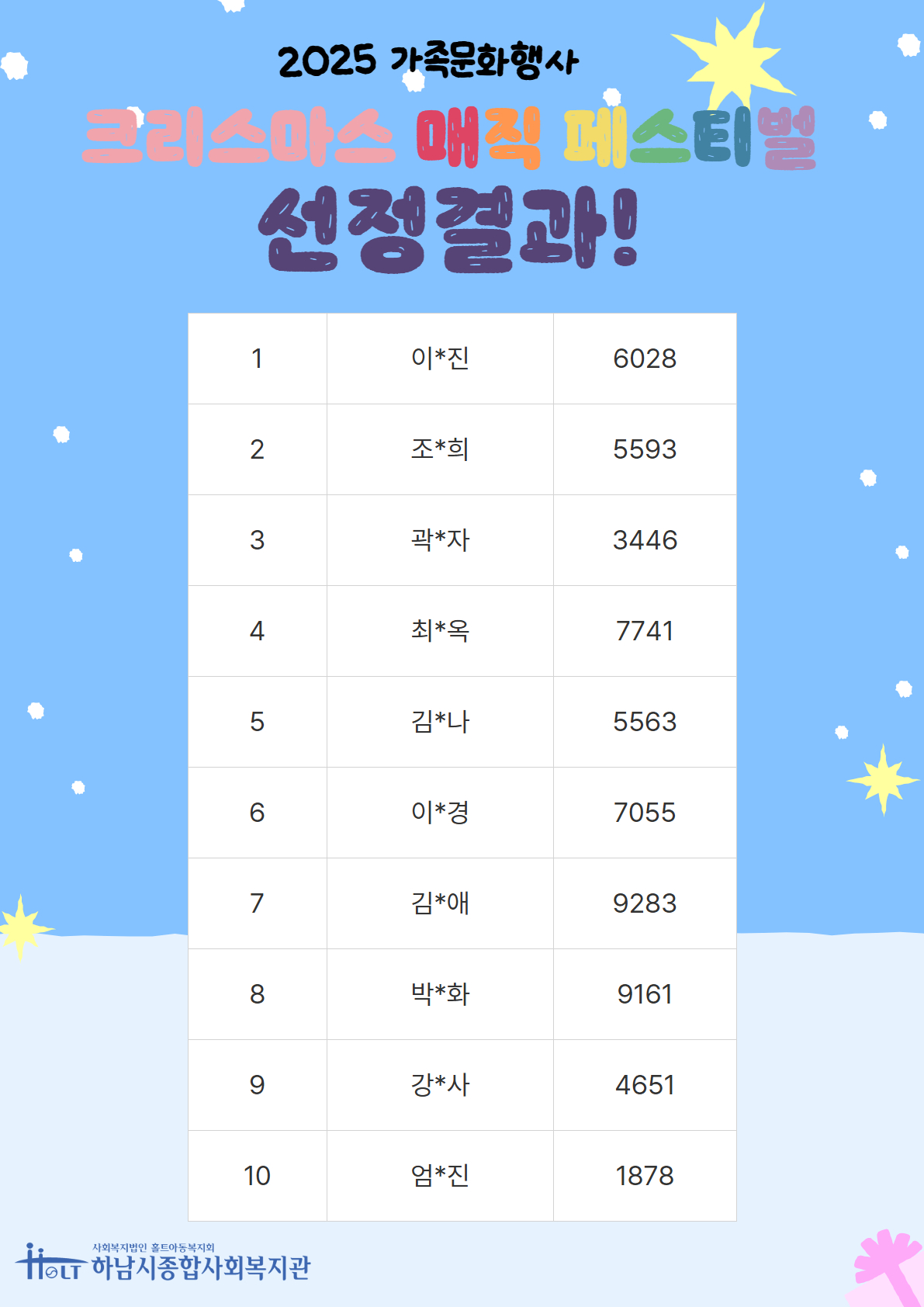 2025 가족문화행사 크리스마스 매직페스티벌 만족도 조사 추첨결과 작성일 : 2025.12.30 | 조회수 : 1086 첨부파일 : 매직 크리스마스! 홍보물.jpg 2025 가족문화행사'크리스마스 매직페스티벌' 만족도 조사 추첨결과를 발표드립니다.본 선정결과는 추첨 프로그램을 통해 공정하게 선정되었습니다! 궁금하신 경우에는 아래 링크를 통해 확인해주시기 바랍니다!https://youtube.com/shorts/2hs9gCvXZP4?feature=sharehttps://youtu.be/orKcN5Ts1as