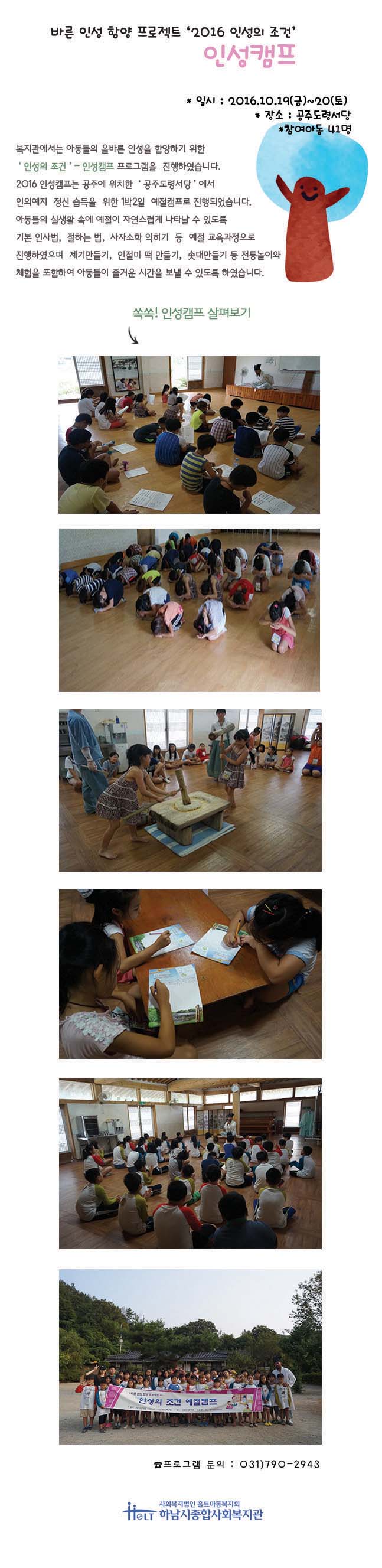 응답하라 2030 서포터즈 중간평가회의 2016-08-26 조회수 12,692 가족문화행사 공연(난타SHOW) 홍보 2016-08-25 조회수 13,647 2016년 '인성의 조건'-인성캠프 실시 2016-08-23 조회수 13,366 교류분석을 통한 체계적인 부모역할 훈련(일정 변경) 2016-08-23 조회수 12,747 어르신 건강체조 강사를 구인합니다. 2016-08-11 조회수 12,659 여름방학체험활동 2016-08-09 조회수 12,947 2016년 제10회 노인자원봉사학교 실시 2016-08-01 조회수 12,770 2016년 여름 가족체험행사 "롯데월드 바캉스" 참가자 모 2016-07-18 조회수 13,089 제7대 기관장 취임식 실시 2016-07-13 조회수 13,104