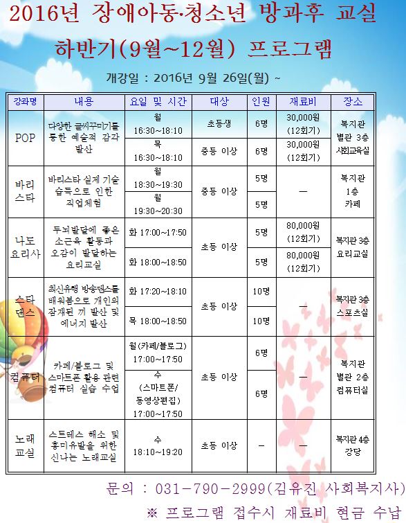 2016년 하반기 장애아동청소년 방과후교실 참여자 모집 작성일 : 2016.09.20 | 조회수 : 15546 2016년 하반기 장애아동,청소년 방과후교실이 개강합니다.프로그램 시간표는 첨부된 사진을 참고 부탁드리며접수는 9월 21일부터 선착순 접수 가능하오니이용자분들의 많은 관심 바랍니다.감사합니다.
