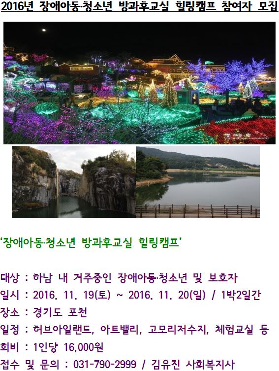 장애아동청소년 방과후교실 힐링캠프 참여자 모집 작성일 : 2016.11.09 | 조회수 : 12357 2016년 장애아동청소년 방과후교실 힐링캠프참여자를 모집합니다! 문의 사항은 031)790-2999 로 연락 주시면감사드리겠습니다. 많은 관심 부탁드립니다.