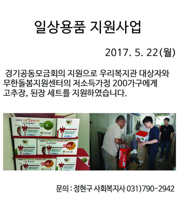 신용보증기금 하남지점 후원금품 전달식 2017-05-26 조회수 12,457 2017년 자원봉사 기초교육 안내 2017-05-25 조회수 11,698 저소득층 일상용품 지원 2017-05-22 조회수 12,394 국민연금공단과 함께하는 장수사진 촬영 2017-05-18 조회수 12,126 동성제약과 함께하는 어르신 염색서비스 '다시 찾은 이팔청춘' 2017-05-14 조회수 12,275 아이품애(온라인육아커뮤니티) 저소득가정 지원을 위한 후원금 전달식 2017-05-11 조회수 12,766 이마트 하남점과 함께하는 사랑의 공기청정기 전달식 2017-05-11 조회수 12,826 가족문화행사 5월 가족의 달 공연(호랑이오빠 얼쑤) 홍보 2017-04-26 조회수 12,754 동성제약 염색봉사단과 함께하는 '다시 찾은 이팔청춘' 2017-03-27 조회수 11,949