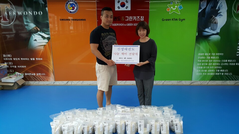 신성태권도 도장에 다니는 학생들이 각 가정에서 모아온 백미 2kg 50봉지를 후원해 주셨습니다.