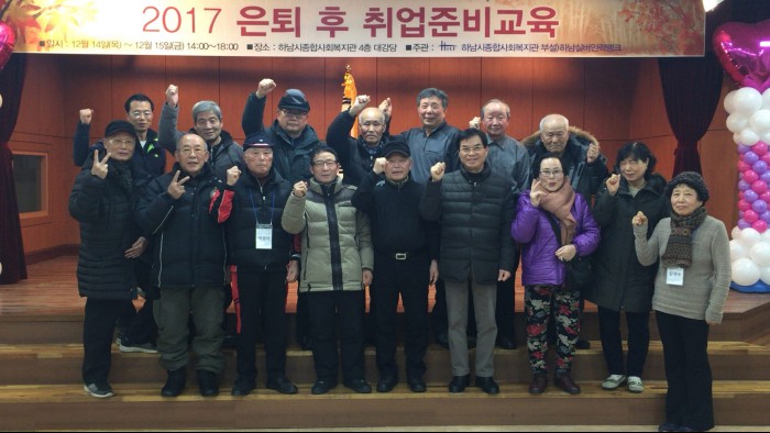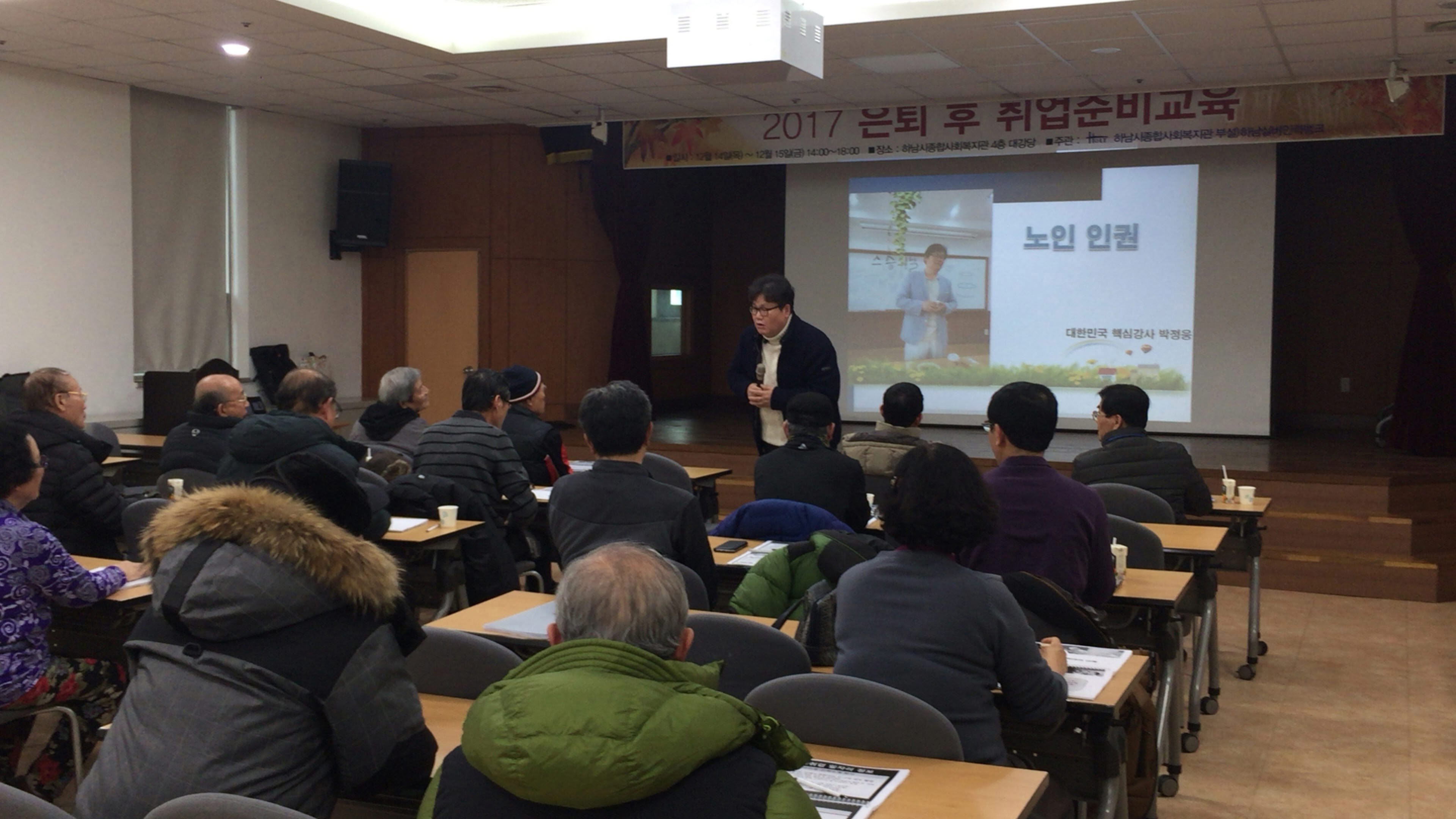 2017년 하반기 은퇴 후 취업준비교육 작성일 : 2017.12.18 | 조회수 : 11955 은퇴 후 어르신들의 구직활동에 도움이 되고자 12월 14,15일 2일간 '은퇴 후 취업준비교육'을 진행하였습니다.추운 날씨에도 복지관까지 찾아주셔서 열심히 교육에 참석하시는 어르신들의 열심히 참여하시는 모습이 참 보기좋았습니다.어르신들의 열정이 꼭 취업성공까지 이루어지시길 기원합니다.감사합니다.