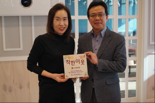 착한이웃 현판 전달식((주)우량산업) 작성일 : 2017.12.19 | 조회수 : 11991 2017년 12월 19일(화) 11:00~12:00 (주)우량산업과 함께 착한이웃 현판 전달식을 진행하였습니다.착한이웃은 관내 기부문화 확산 및 나눔 문화 형성을 위해 복지관과 지속적으로 사회공헌 활동을 수행한 업체에게 전달되고 있습니다.하남시종합사회복지관은 앞으로 정기적으로 복지관과 함께 사회공헌 및 후원을 해주고 있는 업체 및 기업을 대상으로 착한이웃 캠페인을 지속적으로 진행하여 그 수를 늘려갈 예정입니다. 많은 관심 부탁드립니다.