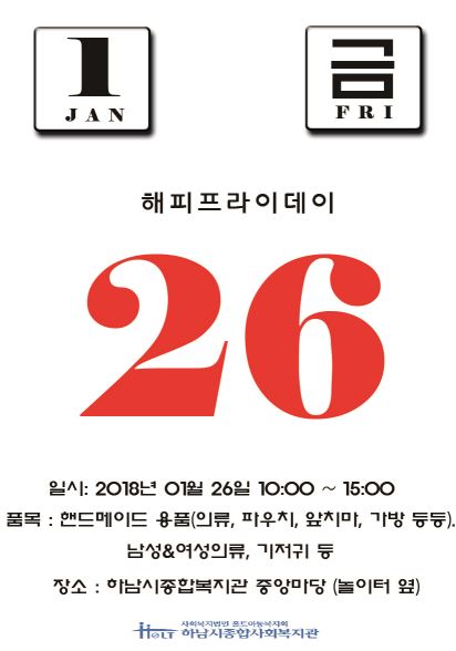 2018년 1월 해피프라이데이 진행 작성일 : 2018.01.18 | 조회수 : 12541 지역사회 저소득 가정 지원 사업비 마련을 위한 해피프라이데이 상설매장을 실시합니다 - 다 음 - 1. 일시 : 2018. 1. 26(금) 10:00~16:00 2. 장소 : 복지관 1층 중앙마당 많은 관심과 참여 부탁드립니다.