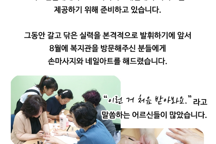 따뜻함을 나누는 봉사단 '따봉' 네일봉사단 이야기 2019-08-20 조회수 12,577 하남이음프로젝트 찾아가는 이동복지관-'다(多)잇다' 진행(신평 2019-08-19 조회수 11,936 아동여름방학체험활동 서대문형무소 견학 2019-08-12 조회수 11,547 아동여름방학체험활동 MBC월드 견학 2019-08-12 조회수 11,801 야간피아노 피아노 강사 모집공고 2019-08-12 조회수 11,696 홀트패밀리# 현판 전달식[산곡지물포] 2019-08-07 조회수 11,893 홀트패밀리# 현판 전달식[황토지장수콩나물] 2019-08-07 조회수 11,986 하계 청소년 자원봉사교육 진행 2019-08-02 조회수 11,644 리틀포레스트 Play!-채움놀이터(여름숲편) 진행 2019-07-29 조회수 12,194