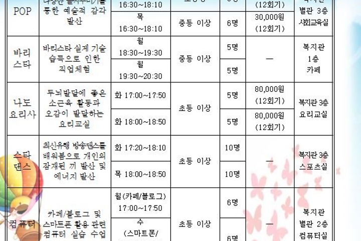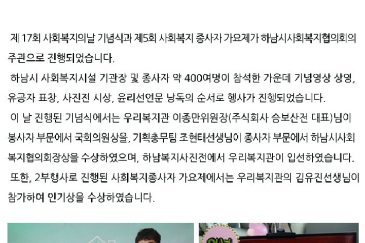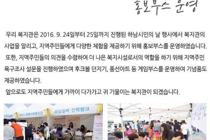 미사리유니온페스티벌&하남시민의날체육대회 홍보부스 운영 2016-09-27 조회수 12,795 2016년 하반기 장애아동청소년 방과후교실 참여자 모집 2016-09-20 조회수 15,543 저학년 초등학생 심리운동 프로그램 2016-09-13 조회수 13,452 부모를 위한 심리운동 2016-09-13 조회수 12,426 제17회 사회복지의날 기념식 및 제5회 사회복지종사자 가요제 참석 2016-09-12 조회수 11,906 2016년 자원봉사 기초교육 실시 2016-09-12 조회수 12,164 노인 사회활동 지원사업 보수교육 실시 완료 2016-09-01 조회수 12,655 2016년 자원봉사 기초교육 안내 2016-08-31 조회수 12,151 노인 사회활동 지원사업 참여자 보수교육 실시 2016-08-29 조회수 12,588