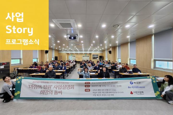 2025년 어버이날 맞이 재가노인 식사배달 진행 2025-05-12 조회수 973 2025 얘들아 놀자, 어린이날 대축제 진행 2025-05-09 조회수 1,077 2025년 하남먹거리 ‘식사는 하셨어요?’ 사업실시 2025-04-30 조회수 789 2025년 '오늘은 노는 날!'- 가족과 함께 노는 날 1회기 2025-04-30 조회수 1,022 "마음의 정원" 오리엔테이션 - 희망의 씨앗 진행 2025-04-29 조회수 1,256 2025 장애인의 날 행사 "우리 손잡GO, 함께GO" 2025-04-29 조회수 1,167 개관 20주년, 기념 '으쓱(ESG) 페스티벌' 2025-04-28 조회수 1,590 "마음의 정원" 주민사업설명회 - 희망의 홀씨 개최 2025-04-25 조회수 1,121 2025년 4월 행복나눔조리봉사단 활동 진행 2025-04-23 조회수 1,012
