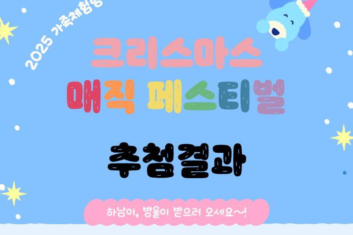2025 가족문화행사 크리스마스 매직페스티벌 만족도 조사 추첨결과 2025-12-30 조회수 1,085 사랑의 밥상(결식아동 도시락배달-월드휴먼브리지) 2025-12-26 조회수 303 2025 가족문화체험프로그램 '케이크 만들기' 2025-12-26 조회수 541 2025년 아동 인권 교육 2025-12-26 조회수 652 2025년 교육문화 무료 특강 2025-12-24 조회수 741 2025년 사람과 사람 사이를 잇다 ‘사이사이’ 최종평가회 2025-12-23 조회수 514 2025년 폐현수막 새활용 프로젝트 <보따리 봉사단> 최종평가회 진행 2025-12-22 조회수 504 2025 가족문화행사 '크리스마스 매직페스티벌' 2025-12-16 조회수 503 2025년 4차 사례관리 외부자문 실시 2025-12-16 조회수 285