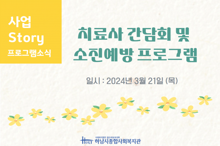 치료사 간담회 및 소진 예방 프로그램 2024-03-27 조회수 3,047 2024 노년의 소중하고 풍성한 만남 '노년소풍' 1회기 실시 2024-03-26 조회수 3,671 2024 꿈디자이너 비전원정대 2회기 실시 2024-03-26 조회수 3,209 2024 꿈디자이너 보호자모임 1회기 실시 2024-03-26 조회수 3,337 사람과 사람 사이를 잇다 ‘사이사이’ 오리엔테이션 2024-03-26 조회수 3,446 자존감 향상을 위한 미술심리 프로그램 2024-03-26 조회수 3,993 오븐엔조이 지에라반 3월 제과제빵 후원 2024-03-25 조회수 3,448 2024년 새학기 신발지원(월드휴먼브리지) 2024-03-25 조회수 3,348 ‘응답하라! 20·30 서포터즈 9기’ 발대식 및 오리엔테이션 2024-03-25 조회수 3,699