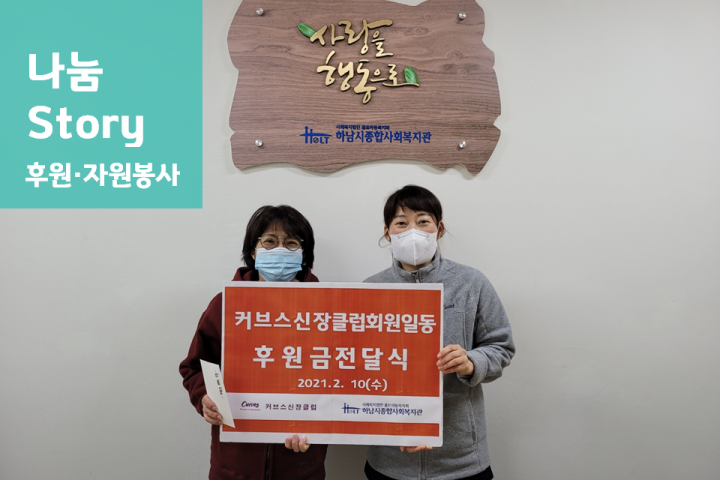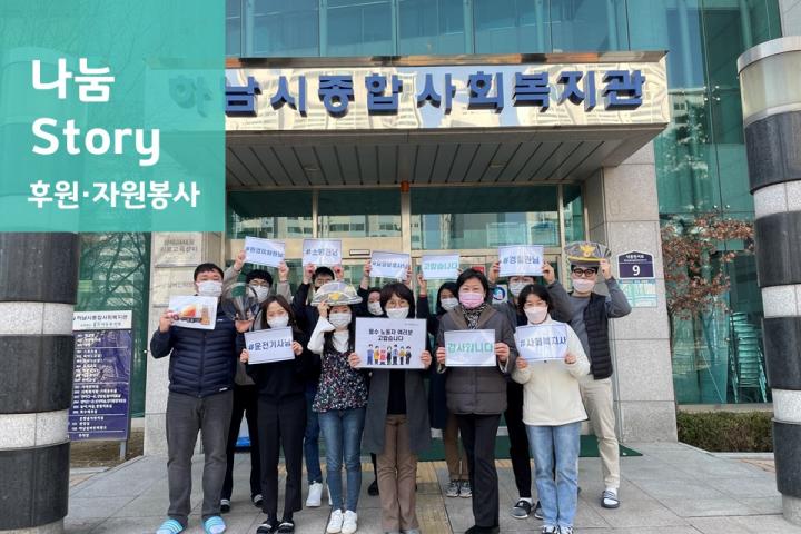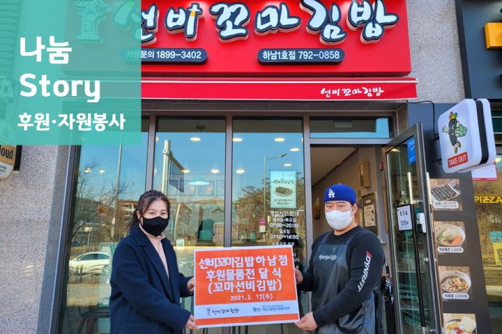 슬기로운 집콕놀이 '퍼그널' 만족도 조사 이벤트 진행 2021-03-08 조회수 12,428 (주)디자인씽킹 업무협약식 진행 2021-02-25 조회수 11,897 고맙습니다! 필수노동자 챌린지 2021-02-23 조회수 12,939 하남이음 Vol.84호 발간 및 구독자 퀴즈 당첨자 안내 2021-02-18 조회수 12,486 선비꼬마김밥[하남1호점] 후원물품 전달식 2021-02-17 조회수 11,814 '카카오 같이가치' 모금 후원금 사용 보고 2021-02-15 조회수 11,927 취약계층 소방안전 점검 2021-02-10 조회수 11,545 한국수자원공사 팔당권지사 취약계층 설 선물 지원 2021-02-10 조회수 11,927 커브스 신장클럽 하남시종합사회복지관 후원금 전달 2021-02-10 조회수 12,427
