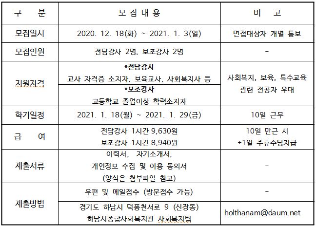하남시종합사회복지관에서는 2020년 겨울방학 늘해랑학교(특수교육대상자의 방학 중 교육 및 보육 프로그램)를 진행하실 강사를 다음과 같이 모집합니다.